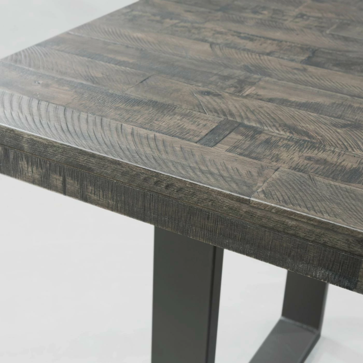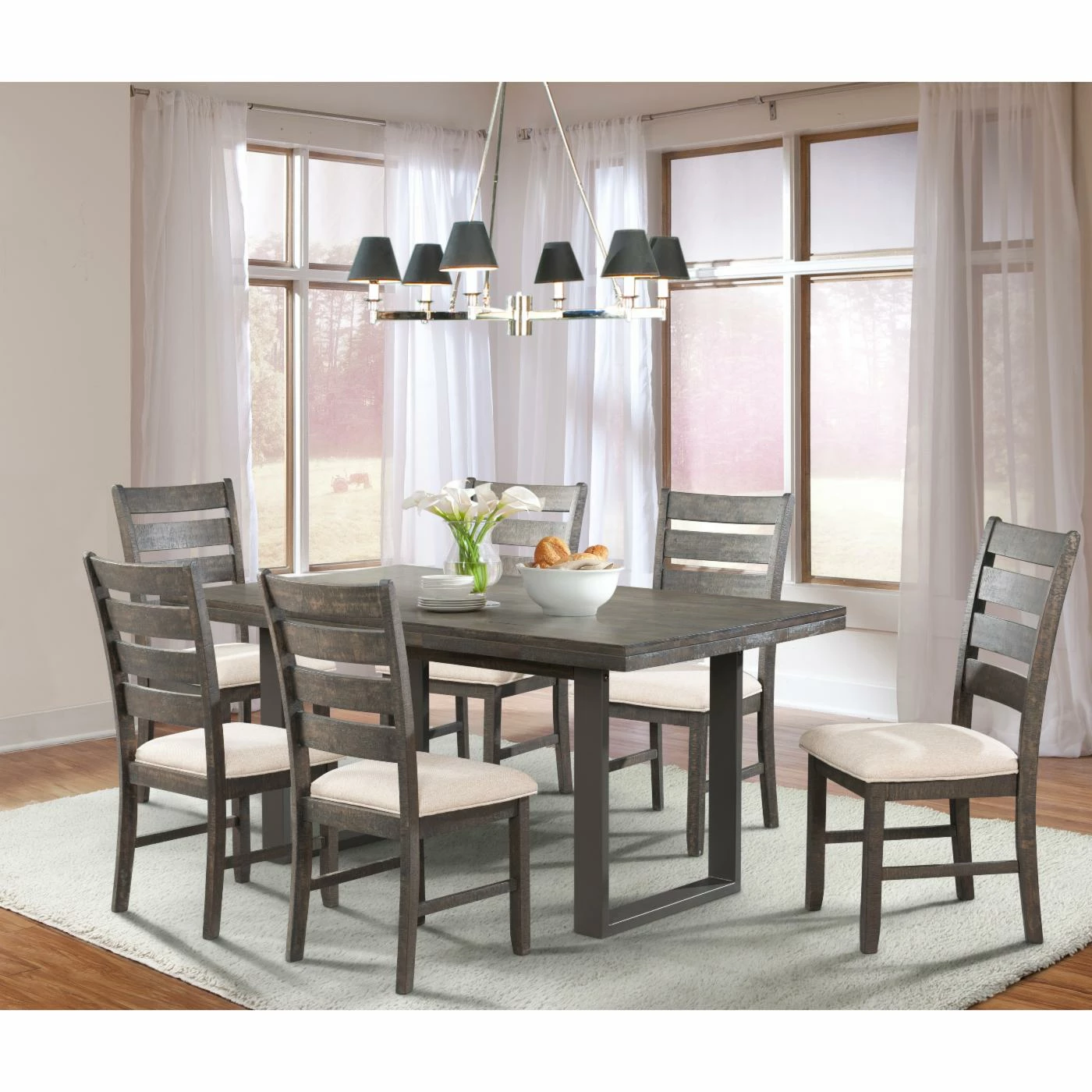 For an updated take on a rustic farmhouse design, the Picket House Sullivan 7 Piece Dining Set blends both styles perfectly. This set includes a generous dining table and six side chairs. Acacia veneers and rubberwood solids are finished in dark ash that allows the wood grain to shine through. Side chairs feature wide ladder backs and padded seats upholstered in cream linen. Welted trim and tapered wood legs add detail. The table stands on thick metal legs formed into open rectangular shapes. It seats six people comfortably.