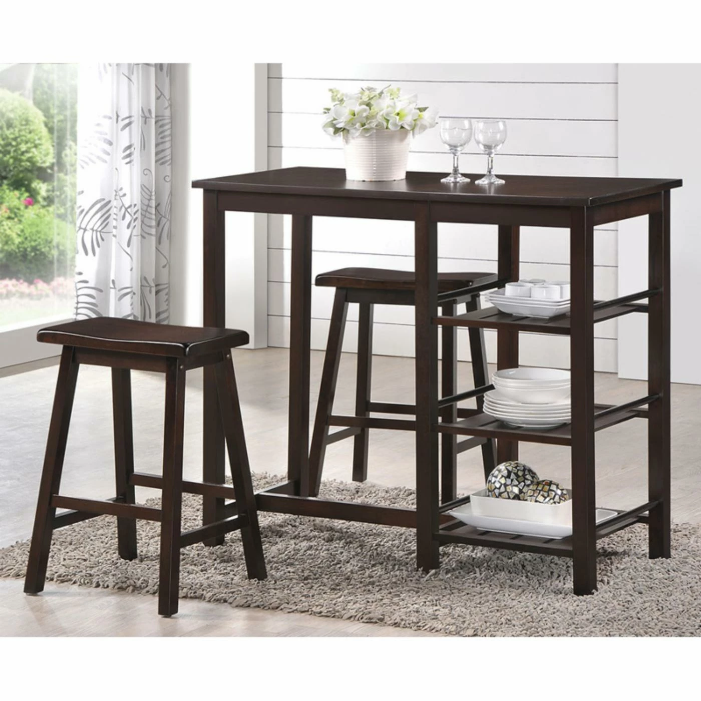 Storage and seating in one? Done! With the Acme Furniture Nyssa 3 Piece Rectangular Counter Height Dining Table Set, a small space becomes an inviting place to partake. Backless saddle stools and the counter-height table with built-in open shelving don’t commit themselves to being either traditional or contemporary. Okumi veneers add a sense of drama.