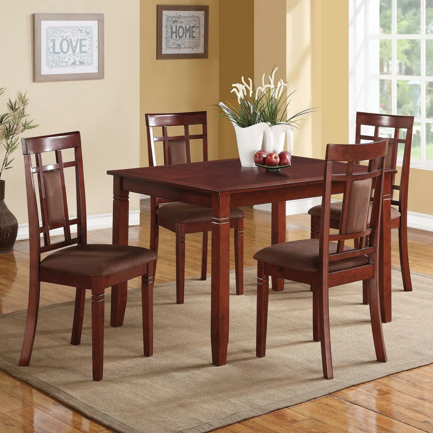 Create a timeless, transitional dining space with the Acme Furniture Sonata 5 Piece Rectangular Dining Table Set. This beautiful set includes a square table with substantial square legs and a top clad with beautiful birch veneers. Chairs feature soft microfiber fabric seats in a rich chocolate hue and coordinating upholstered panels within the latticed backrests. Grooved accents on chair and table legs add just a touch of detail.