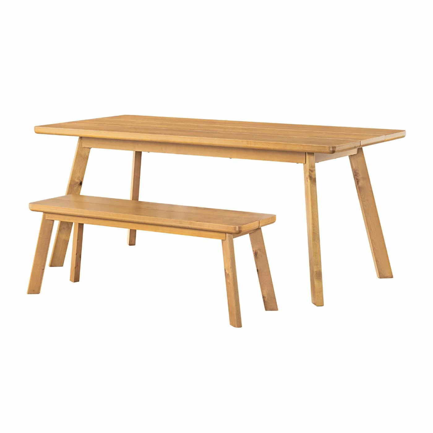 Anchor your dining room or eat-in kitchen with this stunning rectangle dining table with matching bench. With smooth lines and a slightly rounded edge, this table and bench look beautiful, and allow you to both host and dine with ease. The rounded edges and gently sloping legs blend effortlessly with any decor style. Constructed of solid birch legs, composite wood and maple veneer. This set is sure to give your home a warm, inviting vibe.
