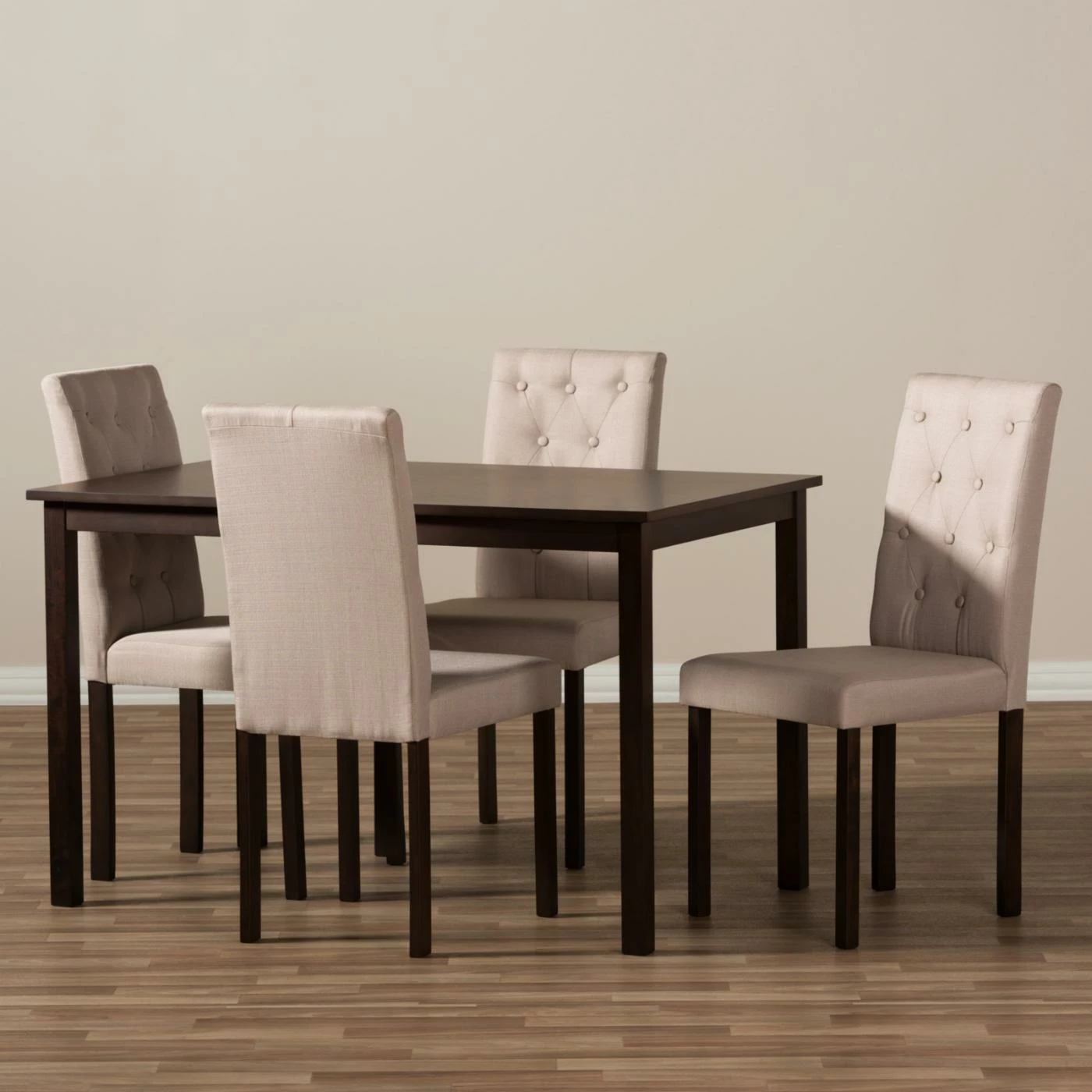 Outfit your new modern dining room with the Baxton Studio Gardner Modern and Contemporary 5 Piece Dark Brown Finish Dining Set with 10 Button Upholstered Dining Chairs. This set provides you with a rectangular dining table and four matching chairs. Each piece in the set is supported by a robust wood frame with an attractive dark brown finish. The armless dining chairs are padded with comfortable high-density foam, and then upholstered in a premium fabric. Choose from available color options. A diamond button-tufted design accents the backrests.