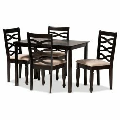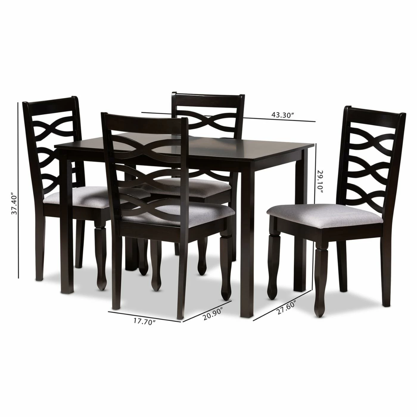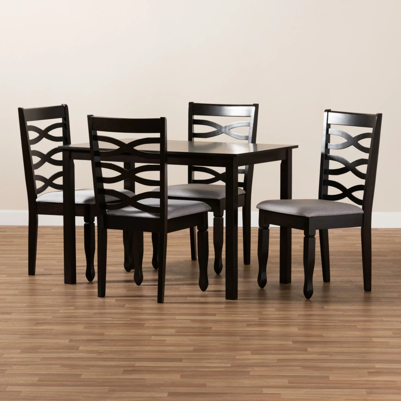 Dine in comfort and style with the Baxton Studio Lanier Upholstered 5 Piece Dining Table Set. If you have a smaller dining room or kitchen, don’t worry – this dining set is perfect for small spaces. The rectangular table is made of engineered wood in an espresso finish that matches the rubberwood chairs. Each chair features an intricate cut-out design on the back and a comfortable foam seat upholstered in polyester. The front two legs of each chair are curved and feature carved details at the top. Choose from available fabric colors to find the dining set that works best for your home.