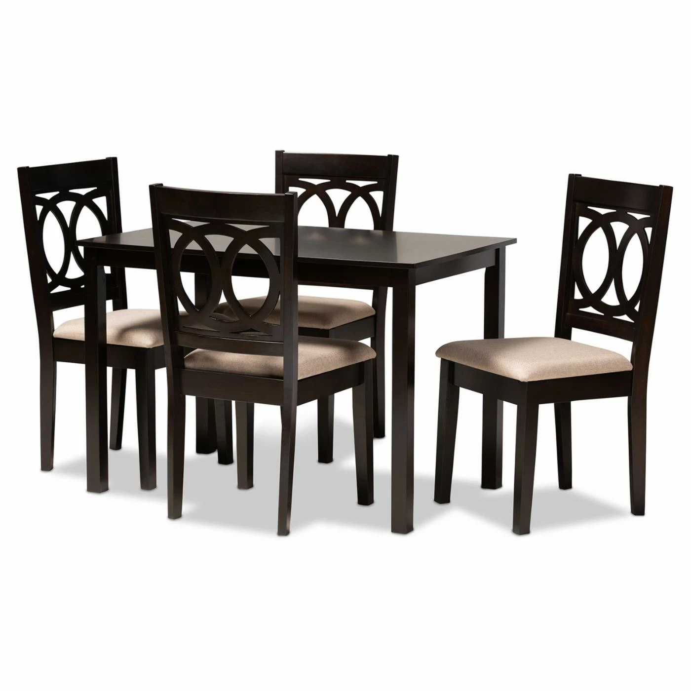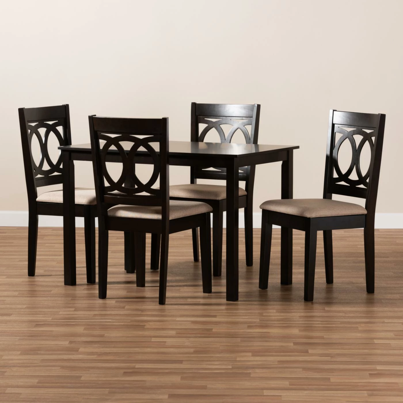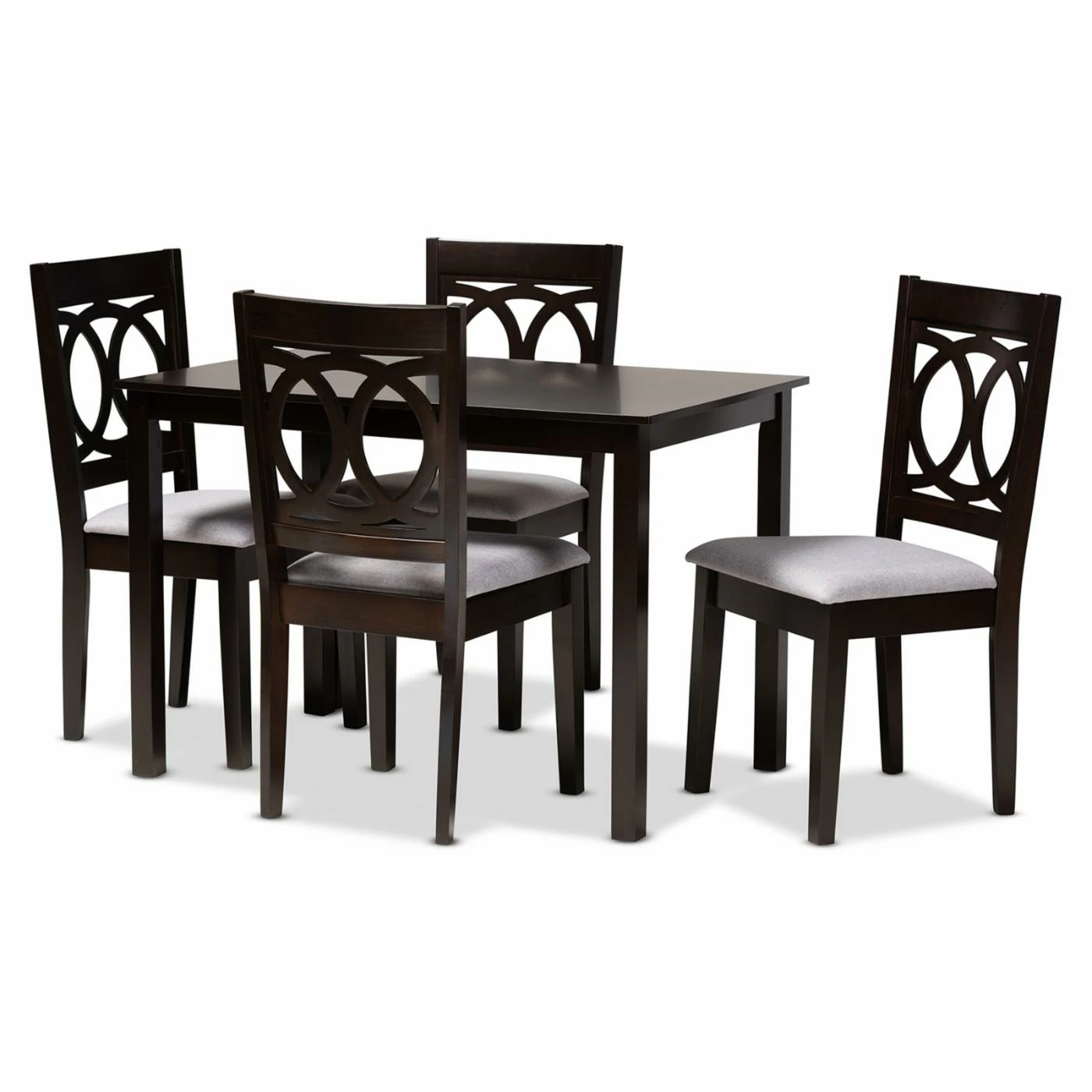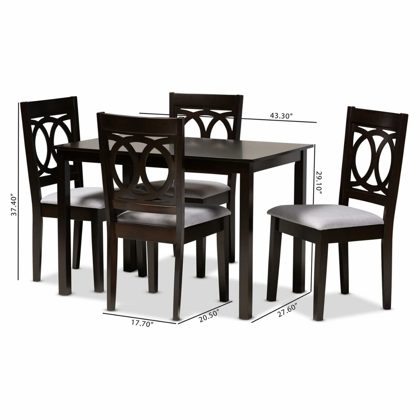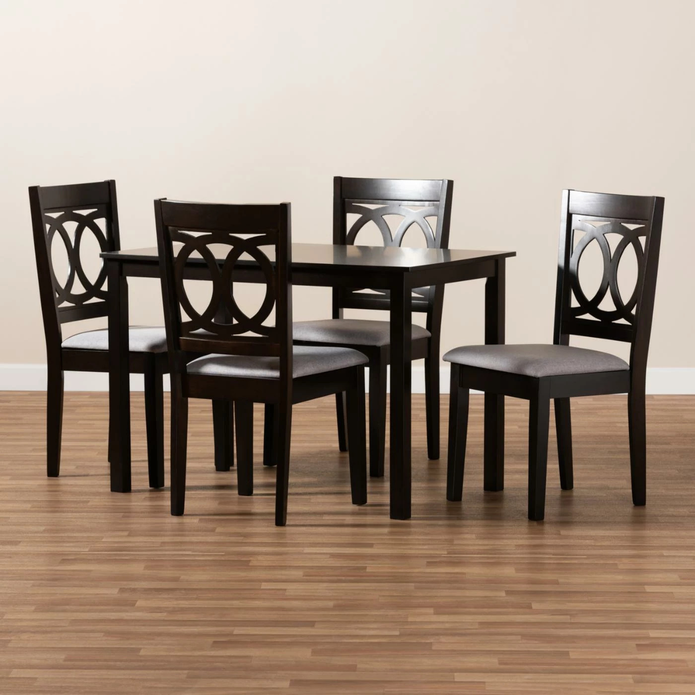 Dine in style with the Baxton Studio Lenoir Upholstered 5 Piece Dining Table Set. This set includes one rectangular table and four chairs. Perfect for small space dining, the wood table is in a rich espresso finish, matching the rubberwood chairs. Each chair has a comfortable foam seat upholstered in polyester (choose from available fabric colors). The chair backs have an intricate, circular cut-out design, adding visual interest to the set. With its clean lines and simple design, this dining set works with a variety of home dรฉcor styles. Some assembly required.