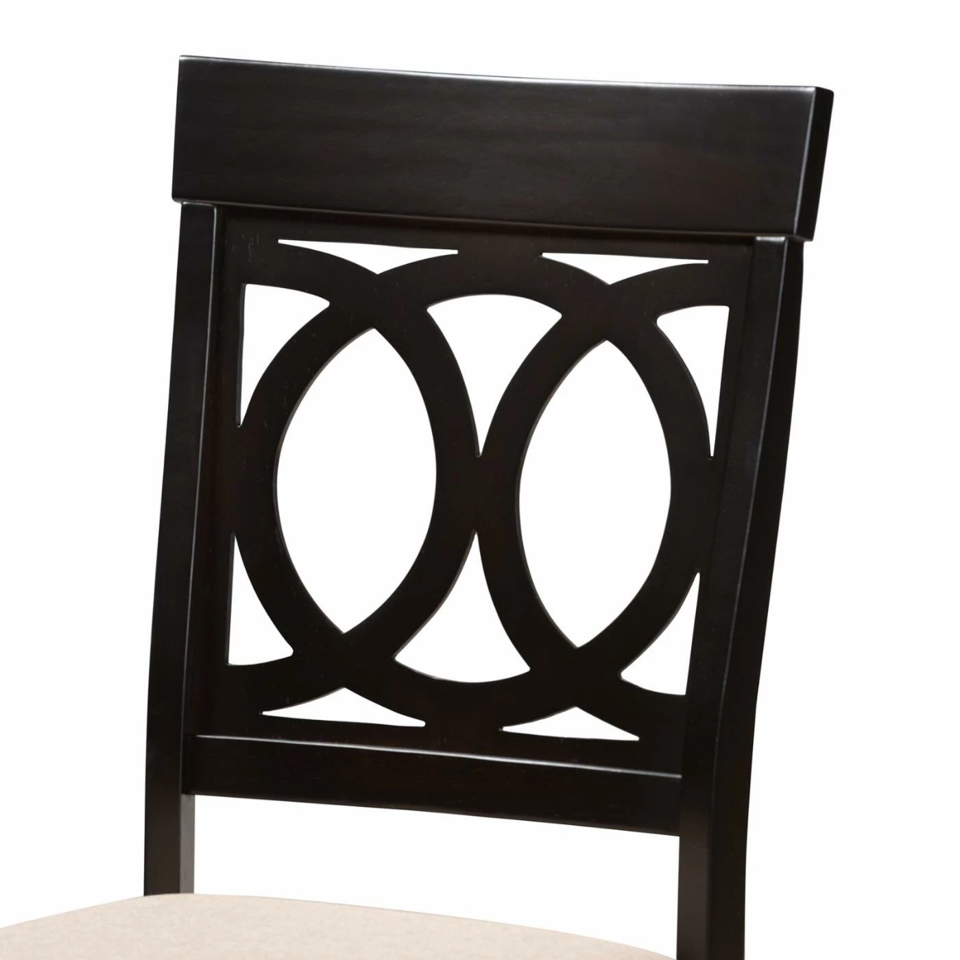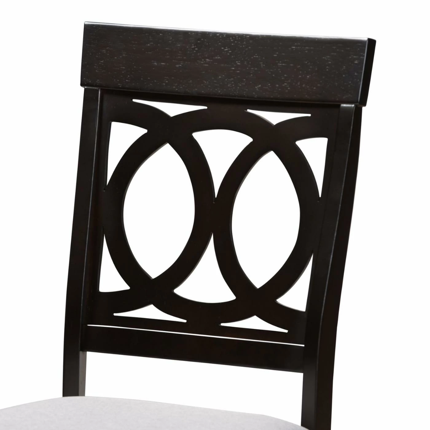 Gather round the table with the Baxton Studio Lucie 5 Piece Dining Table Set. Solid rubberwood construction and a rich espresso finish let the wood of these dining chairs be the star of the show, from the front leg turned globe detail to the interlocking circle design on the back. Durable neutral upholstery sits over a comfortable foam pad. The sturdy rectangular table features matching wood and a no-nonsense silhouette that goes with everything. This transitional style is easy to match and coordinate with your existing dining room dรฉcor. Some assembly required. Spot clean as needed.
