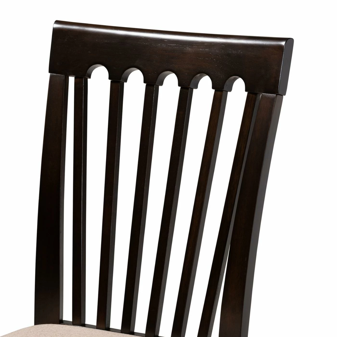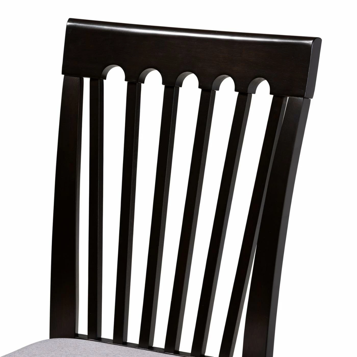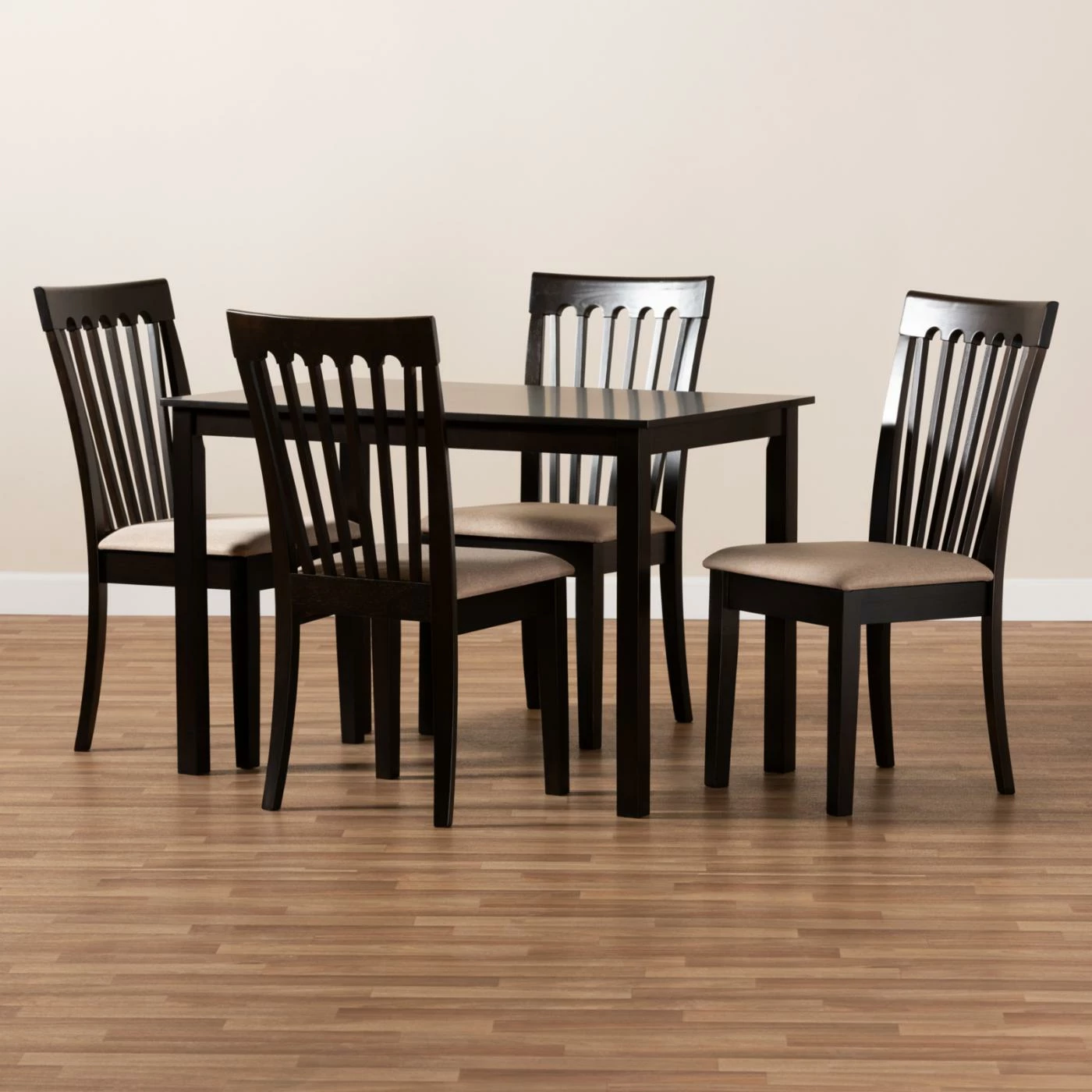 The Baxton Studio Minette Upholstered 5 Piece Dining Table Set adds contemporary style to your home. Perfect for small space dining, this wood table is in a rich espresso finish, matching the rubberwood frames of the chairs. Each chair back features a vertical cut-out design and a comfortable foam seat upholstered in polyester. Choose from available fabric colors to find the dining set that works best with your home décor. This set includes one table and four chairs. Some assembly required.