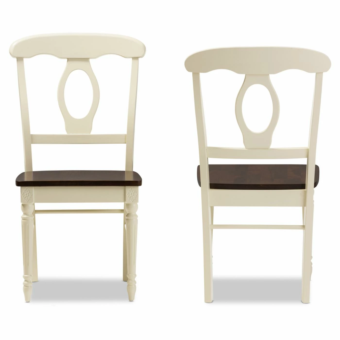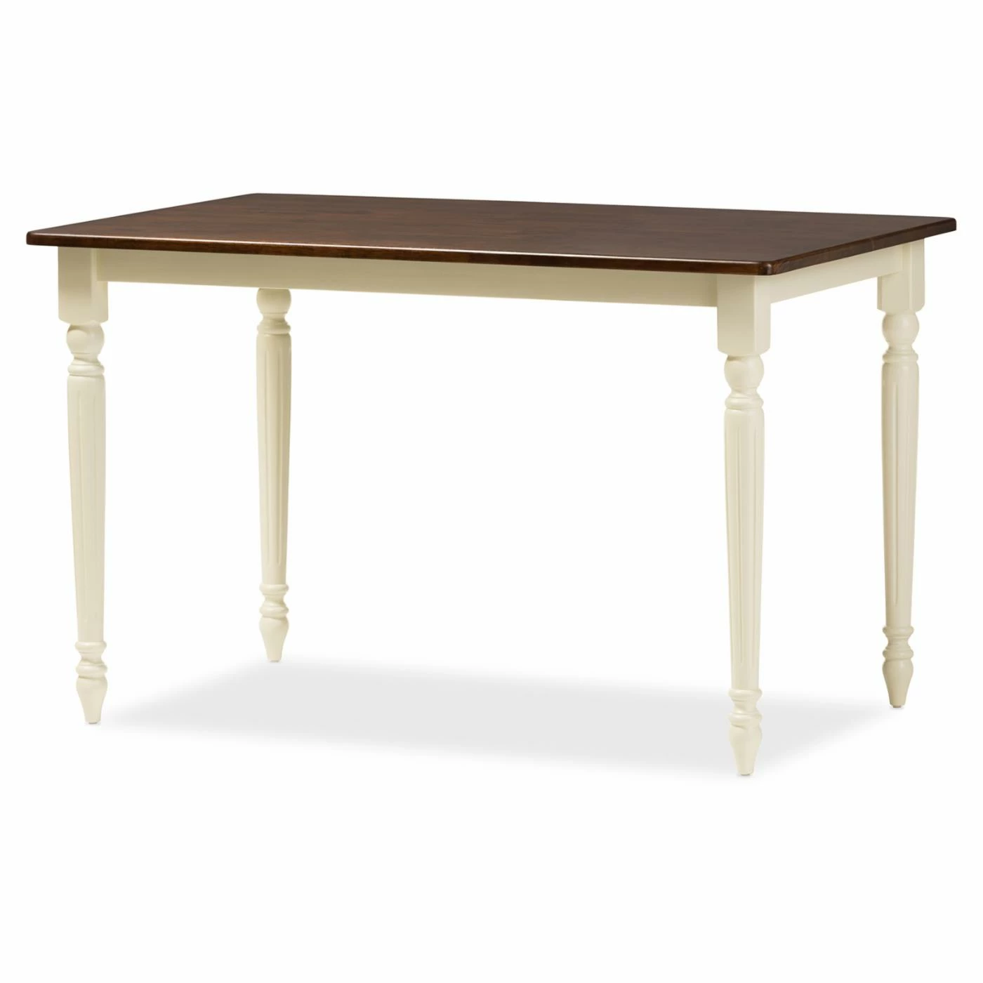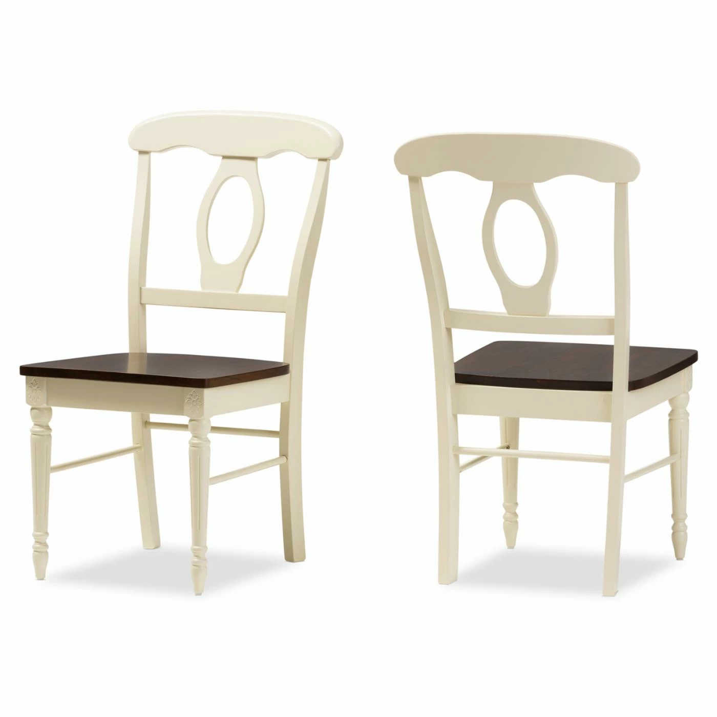 The Baxton Studio Napoleon 5 Piece Dining Table Set mixes soft buttermilk tones with rich antiqued cherry to give this dining set an incredible contrast. The beautiful chairs are reminiscent of seating you’d find in a country cottage, and the sturdy table is enhanced with turned legs.