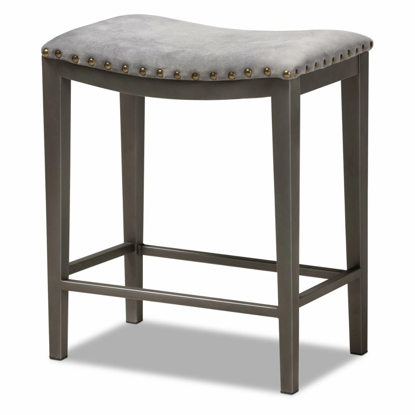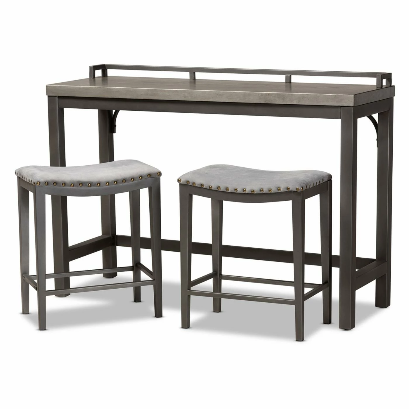 Whether your style skews industrial or Scandinavian, the Baxton Studio Noll 3 Piece Counter Height Dining Set provides a smart addition to your space. This compact counter-height dining set features a gray metal and engineered wood table with a built-in foot rest. Matching stools are crafted from metal with foam padded seats upholstered in gray 100% polyester fabric with brass nailhead trim. Try this versatile set as a casual dining space, workspace, or serving station.