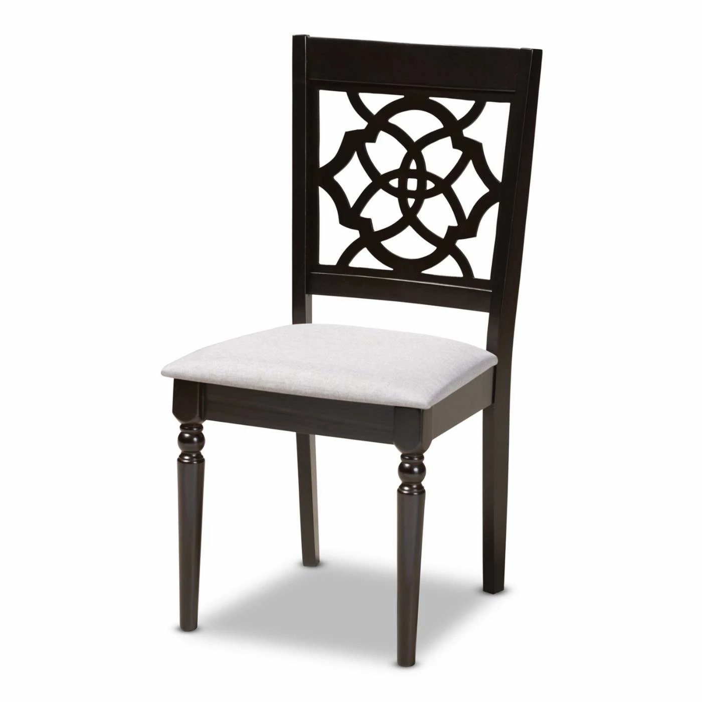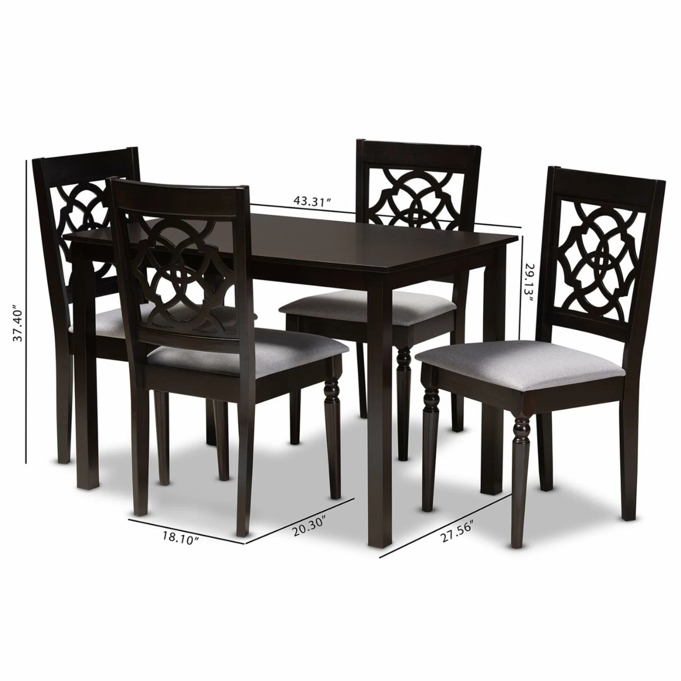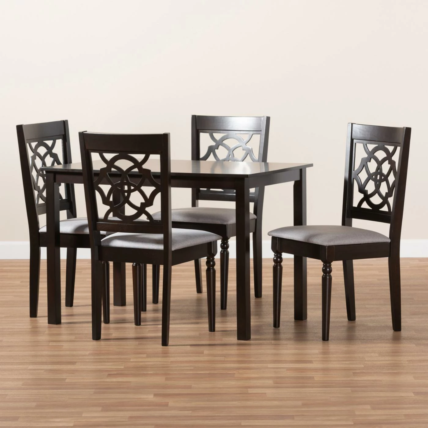 Add some elegance to your dining room with the Baxton Studio Renaud 5 Piece Dining Table Set. Solid rubberwood construction and a rich espresso finish let the wood of these dining chairs be the star of the show, from the front leg turned globe detail to the decorative design on the back. Durable neutral upholstery sits over a comfortable foam pad. The sturdy rectangular table features matching wood and a no-nonsense silhouette that goes with everything. This transitional style is easy to match and coordinate with your existing dining room dรฉcor. Some assembly required. Spot clean as needed.