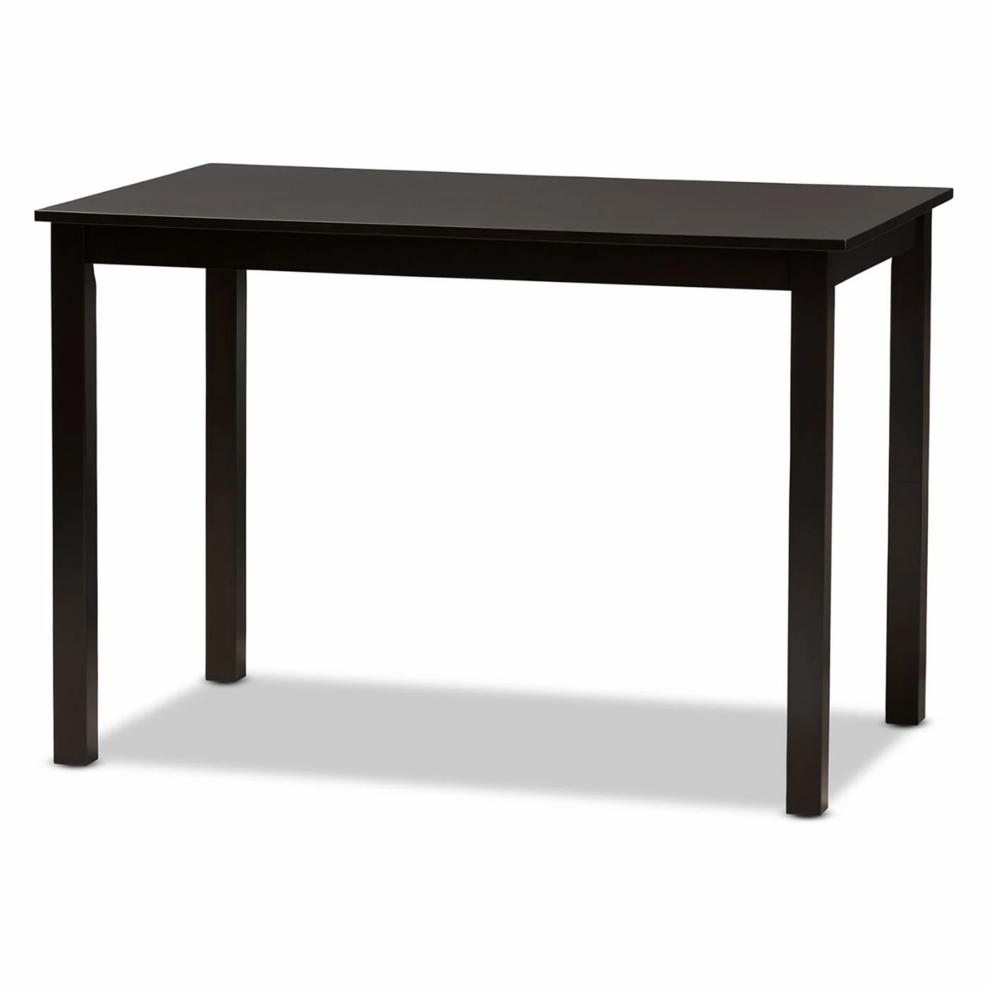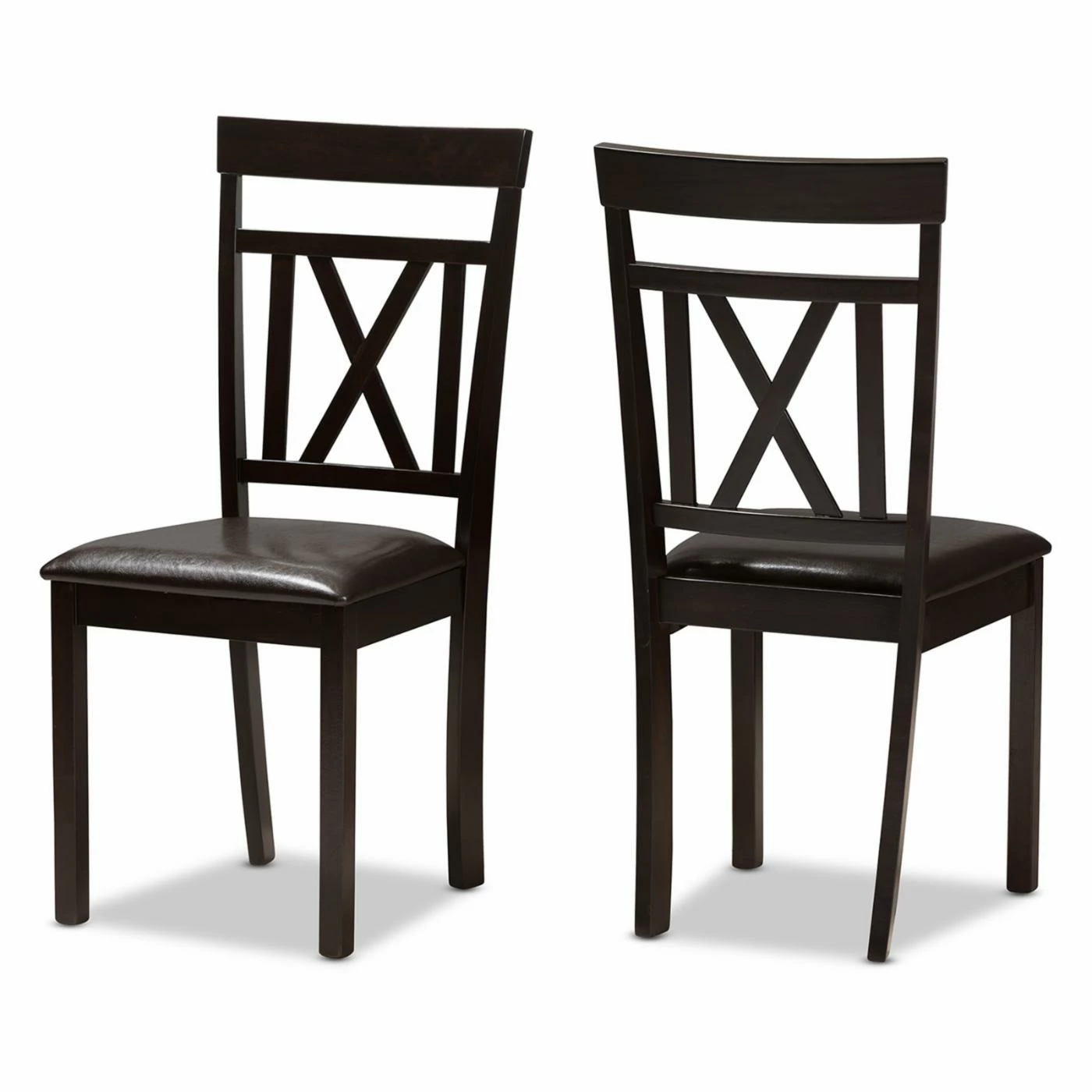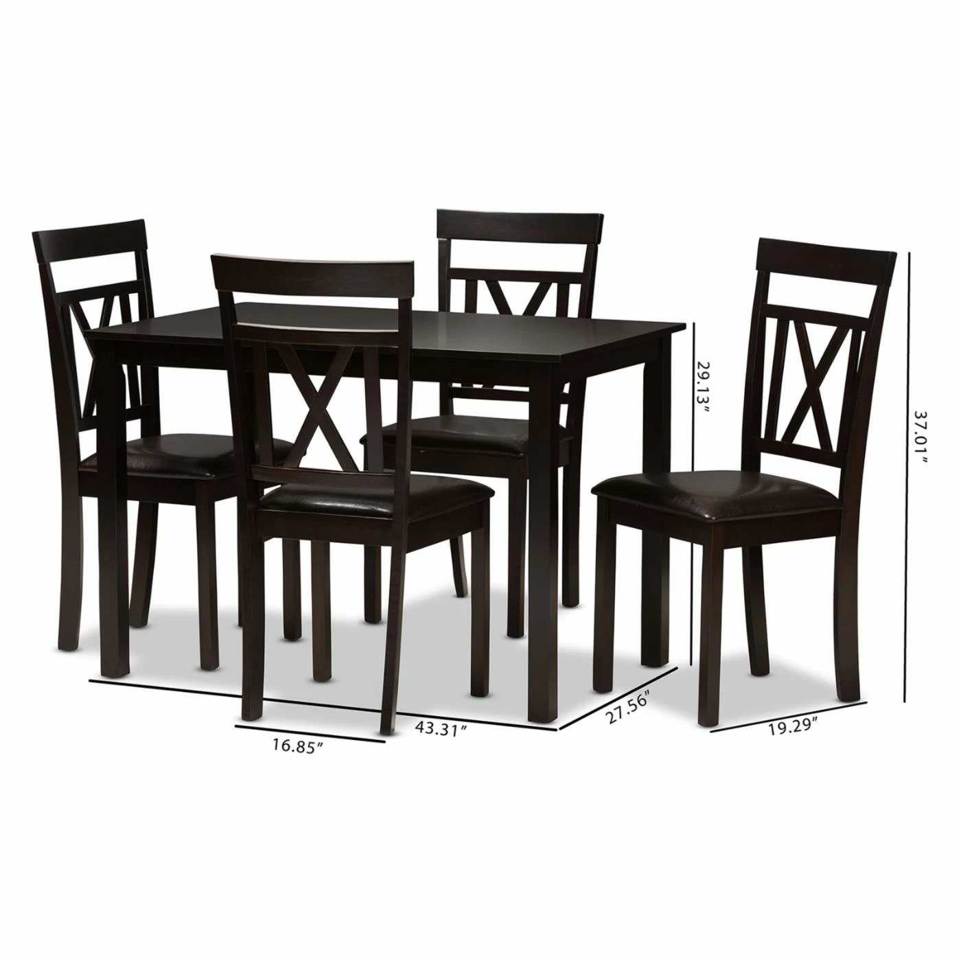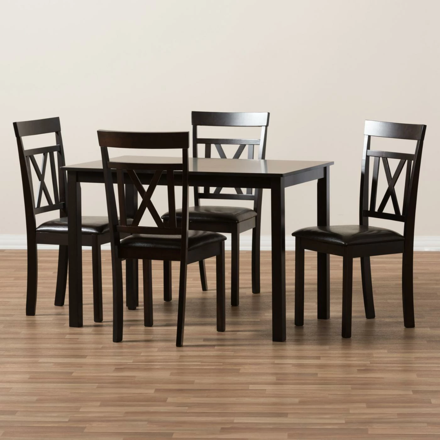 Thanks to its simple style and durable construction, the Baxton Studio Rosie 5 Piece Rectangular Dining Set adds versatility and modern flair to your kitchen or dining space. This attractive dining set includes a sturdy rectangular table with a smooth top and a deep, dark brown finish. A set of four matching chairs with an X-back design and padded seats covered in faux leather upholstery brings the set a dash of comfort and sophistication.