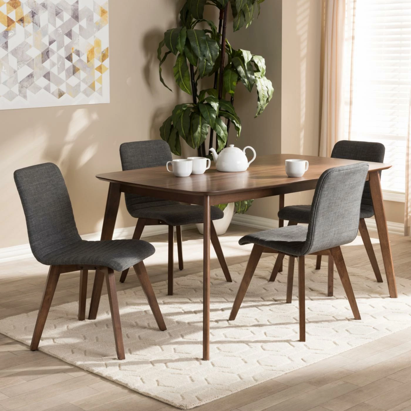 Plan a more relaxed and inviting dining area with the Baxton Studio Sugar Mid-Century Modern Fabric Upholstered 5 Piece Dining Set. This set is built from hardy wood with splayed block legs. A deep walnut brown finish tops the wood. A rectangular table with an overhang top and four matching chairs are included in the set. The chairs have a curved seat and backrest, padded with foam for comfort. Choose your desired fabric color from the available.