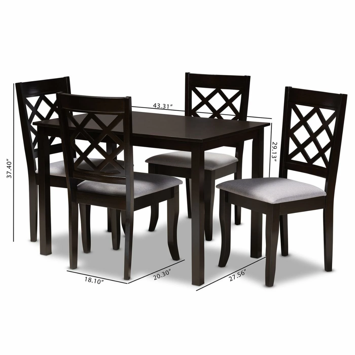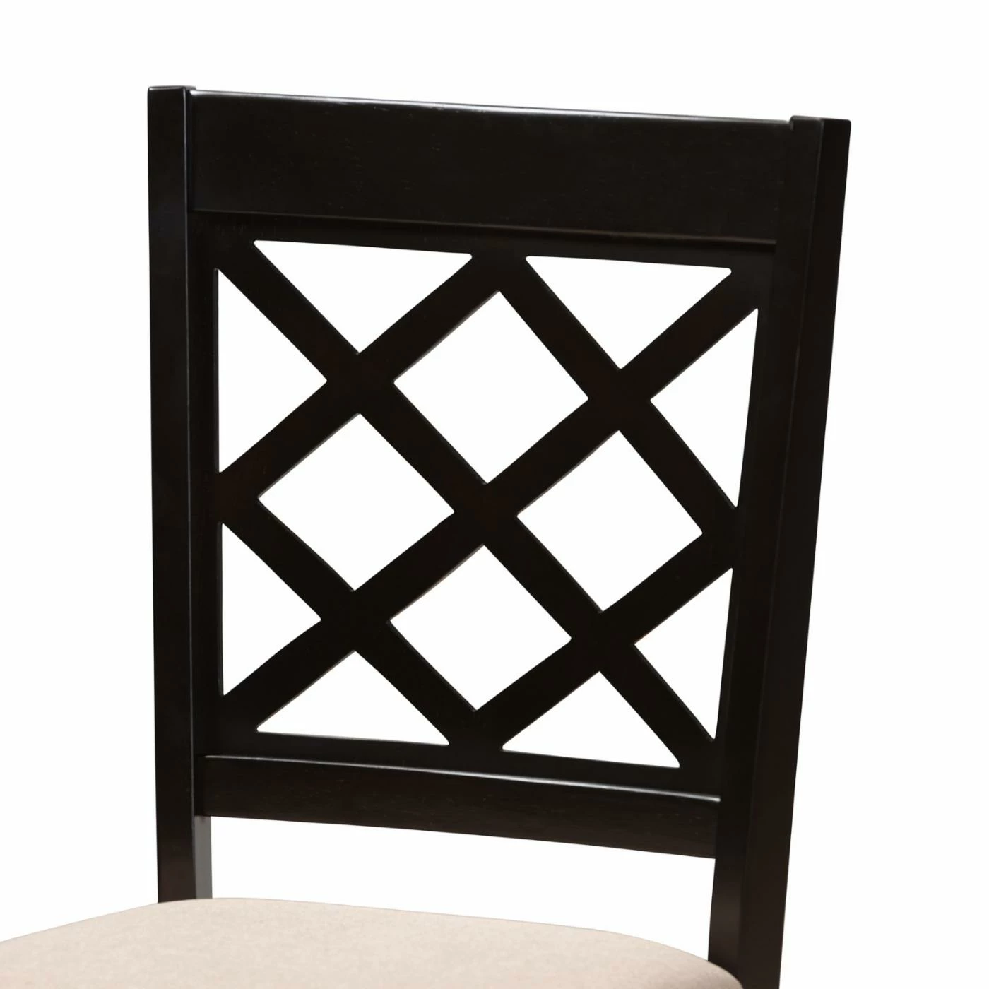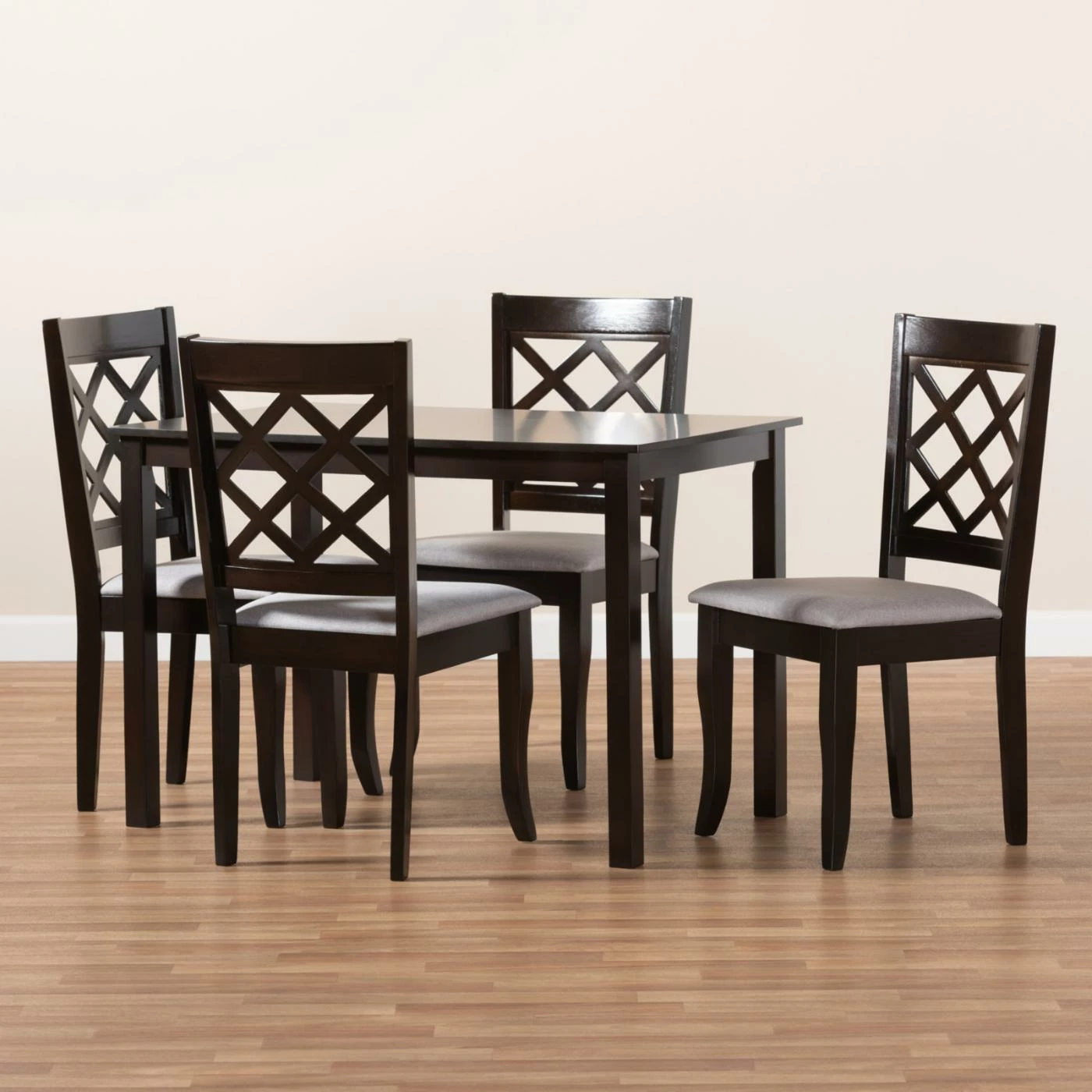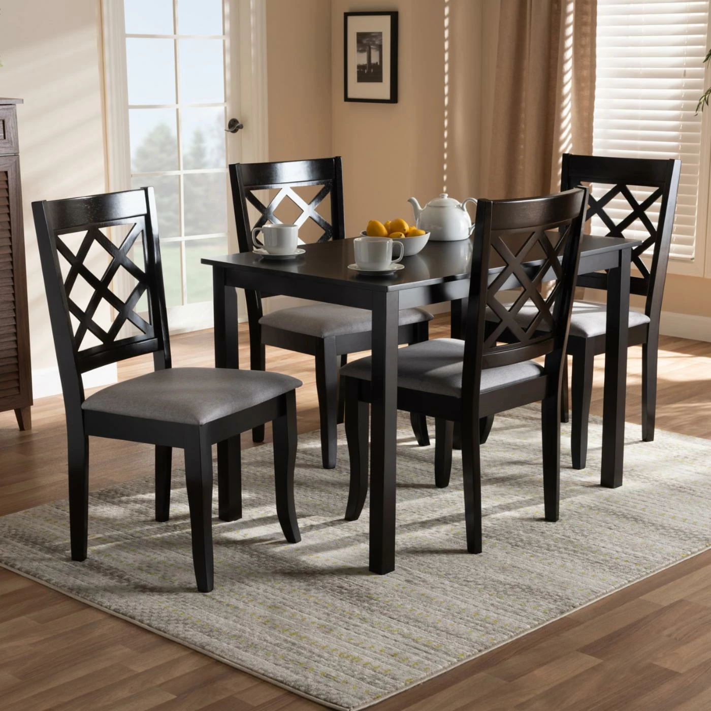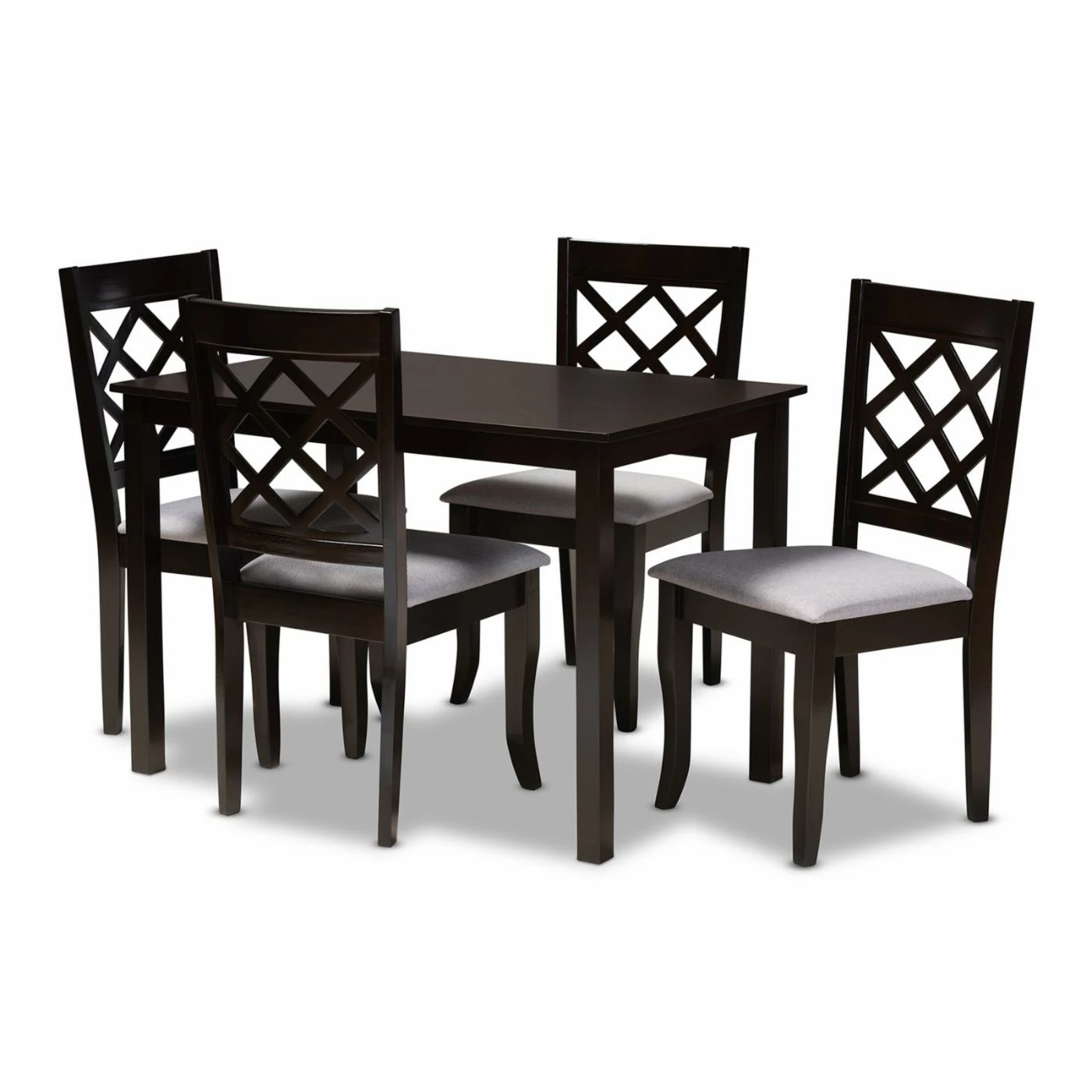 Put your dining room together in a flash with the Baxton Studio Verner 5 Piece Dining Table Set. Solid rubberwood construction and a rich espresso finish let the wood of these dining chairs be the star of the show, from the tapered front legs to the diamond lattice design on the back. Durable neutral upholstery sits over a comfortable foam pad. The sturdy rectangular table features matching wood and a no-nonsense silhouette that goes with everything. This transitional style is easy to match and coordinate with your existing dining room dรฉcor. Some assembly required. Spot clean as needed.
