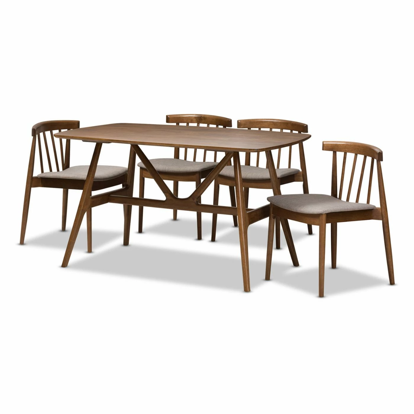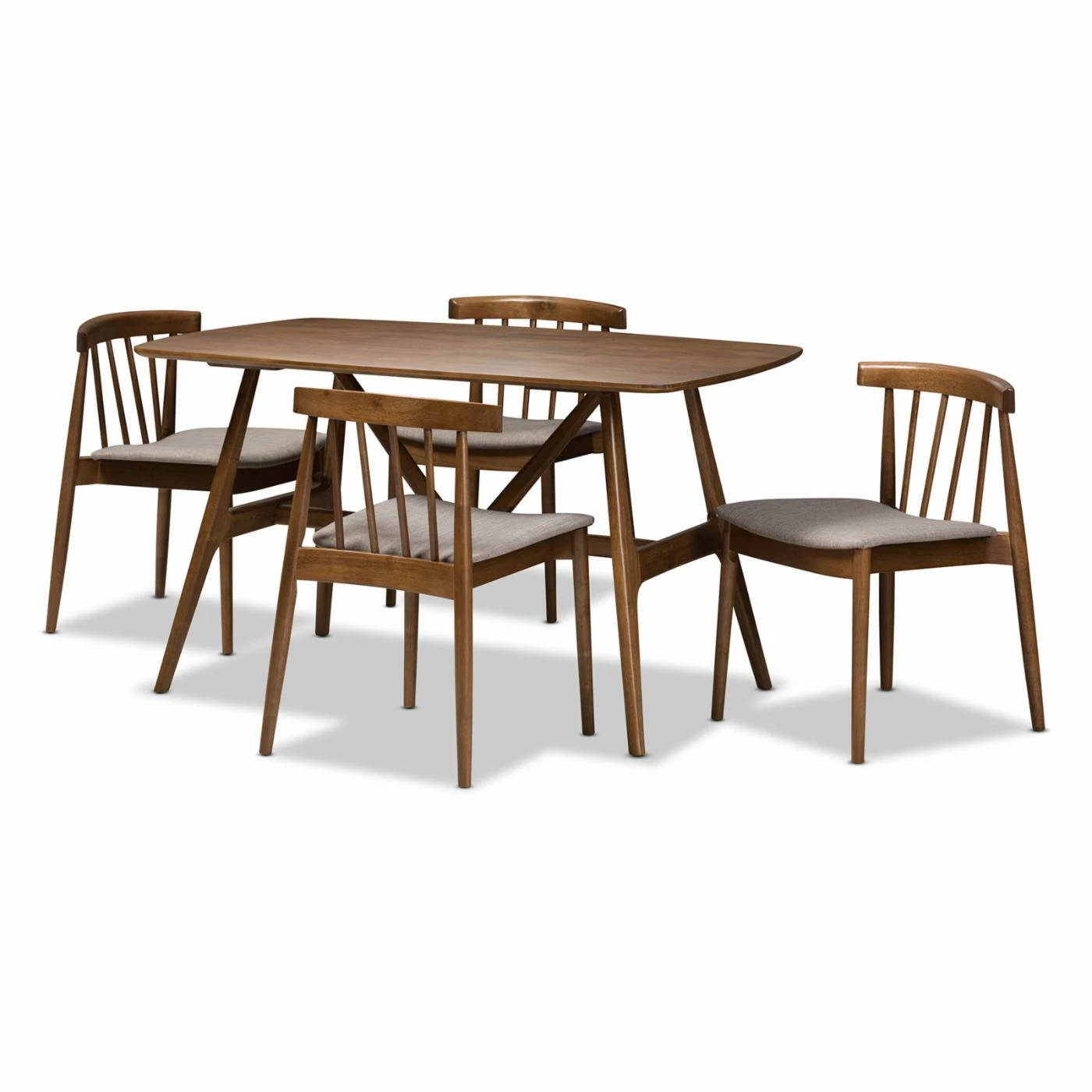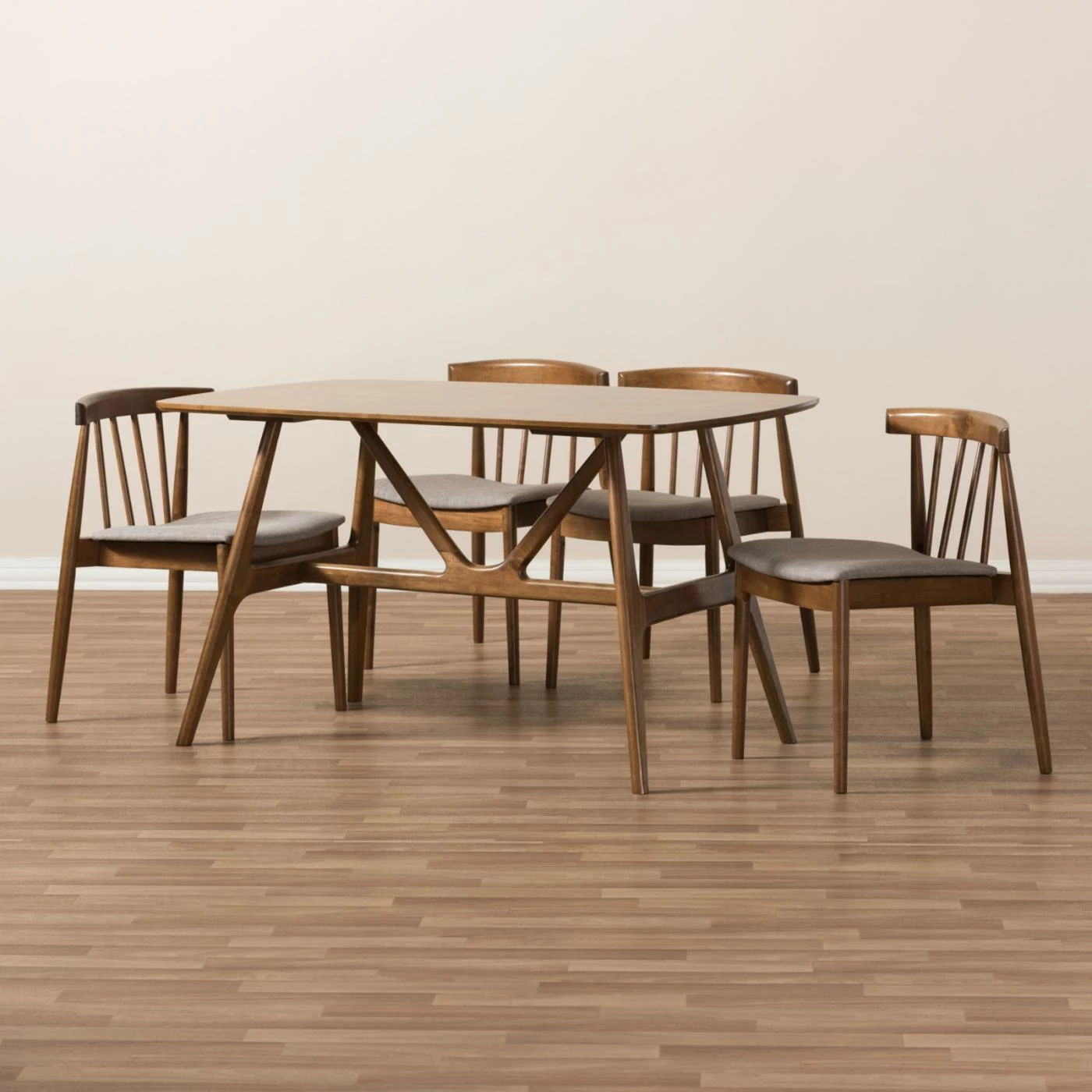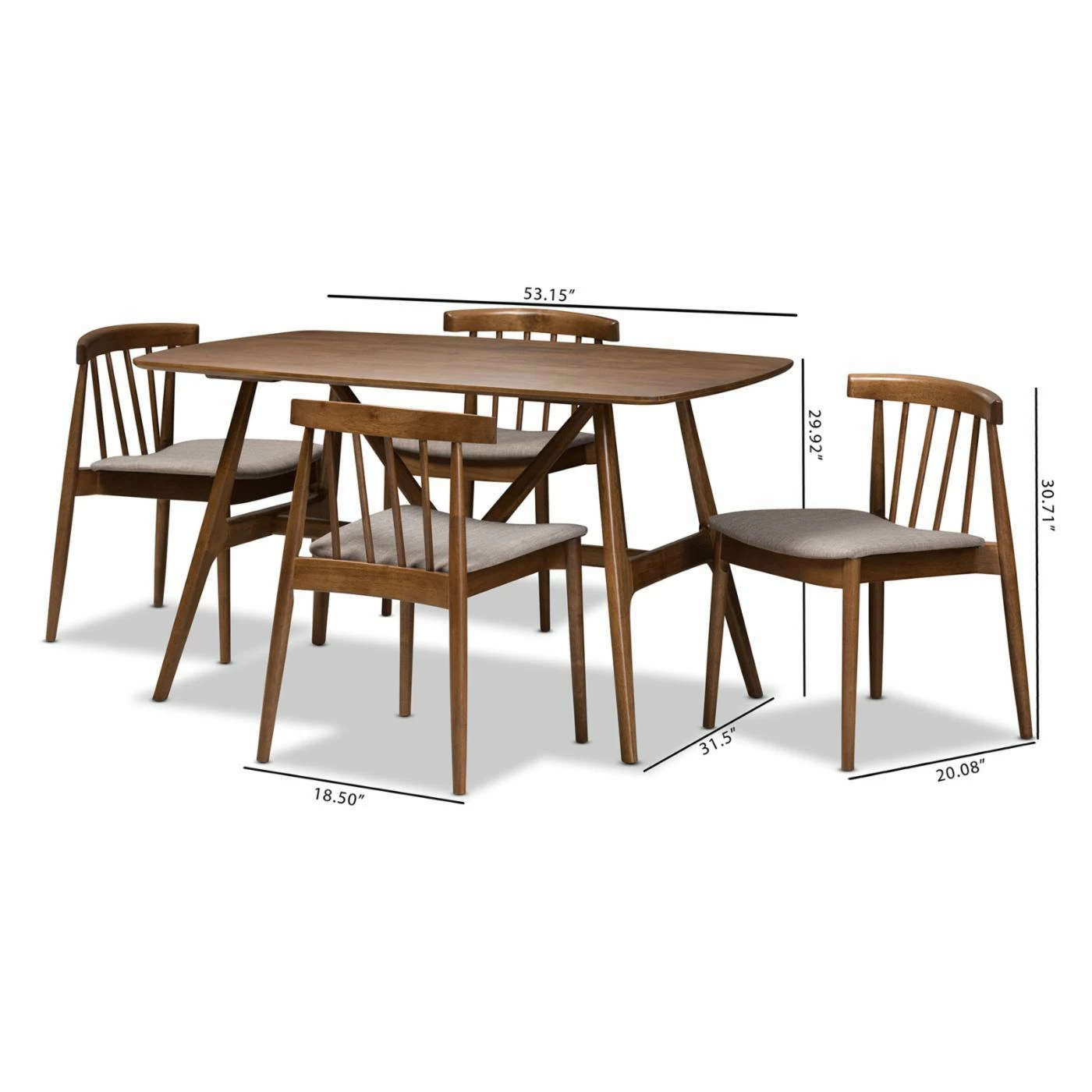 Elevate your dining room to true mid-century modern status with the Baxton Studio Wyatt 5 Piece Rectangular Dining Set, featuring a myriad of details that echo this contemporary style. This amazing dining set includes a sturdy rectangular dining table with rounded corners, tapered legs, and solid rubberwood construction in a warm walnut wood finish. Each of the four chairs feature a curved, spindle back, slender legs, and a padded seat with gray fabric upholstery for a trendy finishing touch.