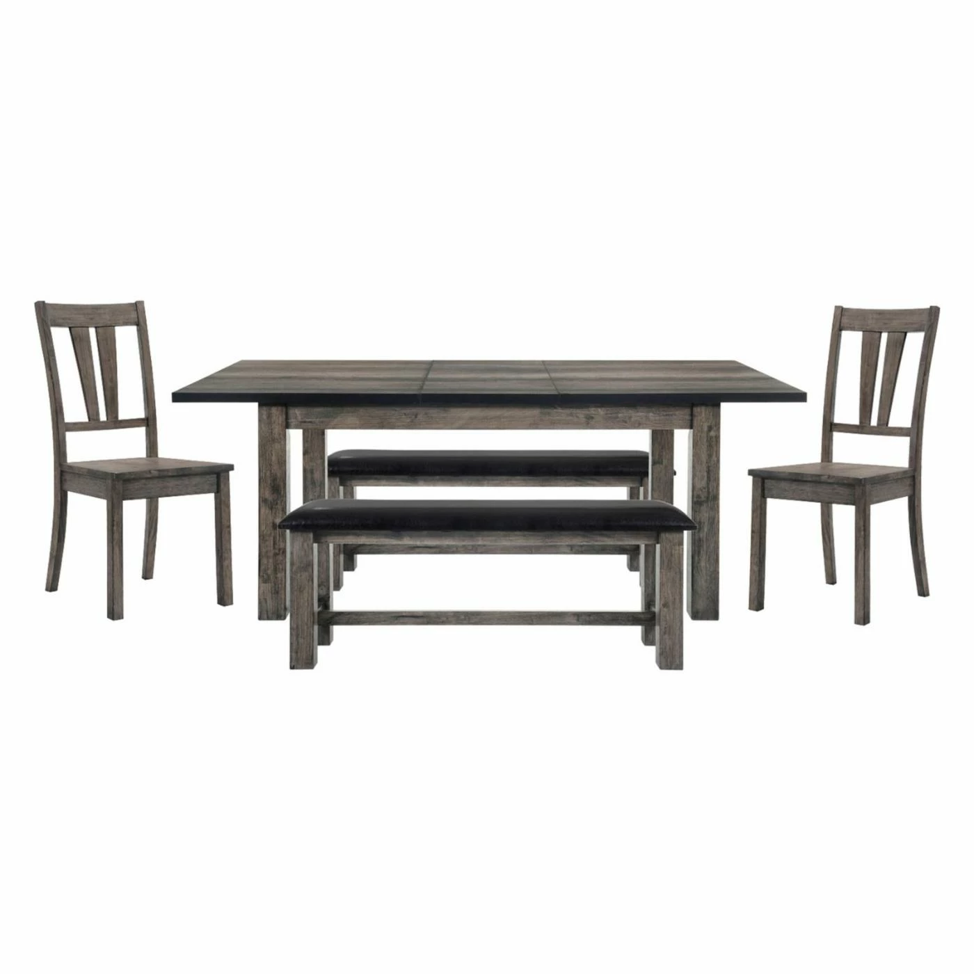 Keep your dining area easy going but sophisticated with the Cambridge Drexel 5-Piece Dining Set with Benches. Crafted from wood with a distressed gray oak finish and rake-back chairs, this set is replete with farmhouse style. With two side chairs and two benches, you’ll have plenty of seating for everyone. Plus, the included leaf allows the table to extend so it seats up to six people, making it ideal for entertaining. Crafted from wood, this dining set is made to withstand the rigors of everyday use.