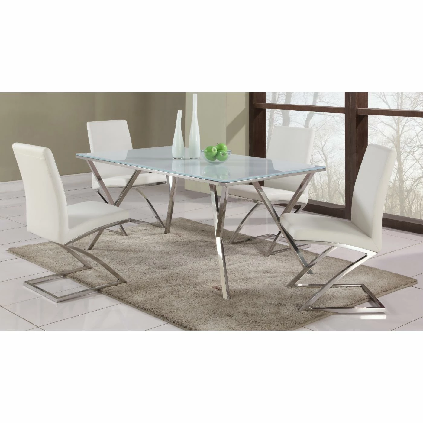You’ll feel right at home with the modern luxury of the Chintaly Jade 5 Piece Dining Table Set with Z Frame Dining Chairs. This breathtaking table features sleek metal legs and a glossy white glass top. Low iron glass for consistent color and clarity. It’s perfectly complemented by the striking modern Z Frame dining chairs.