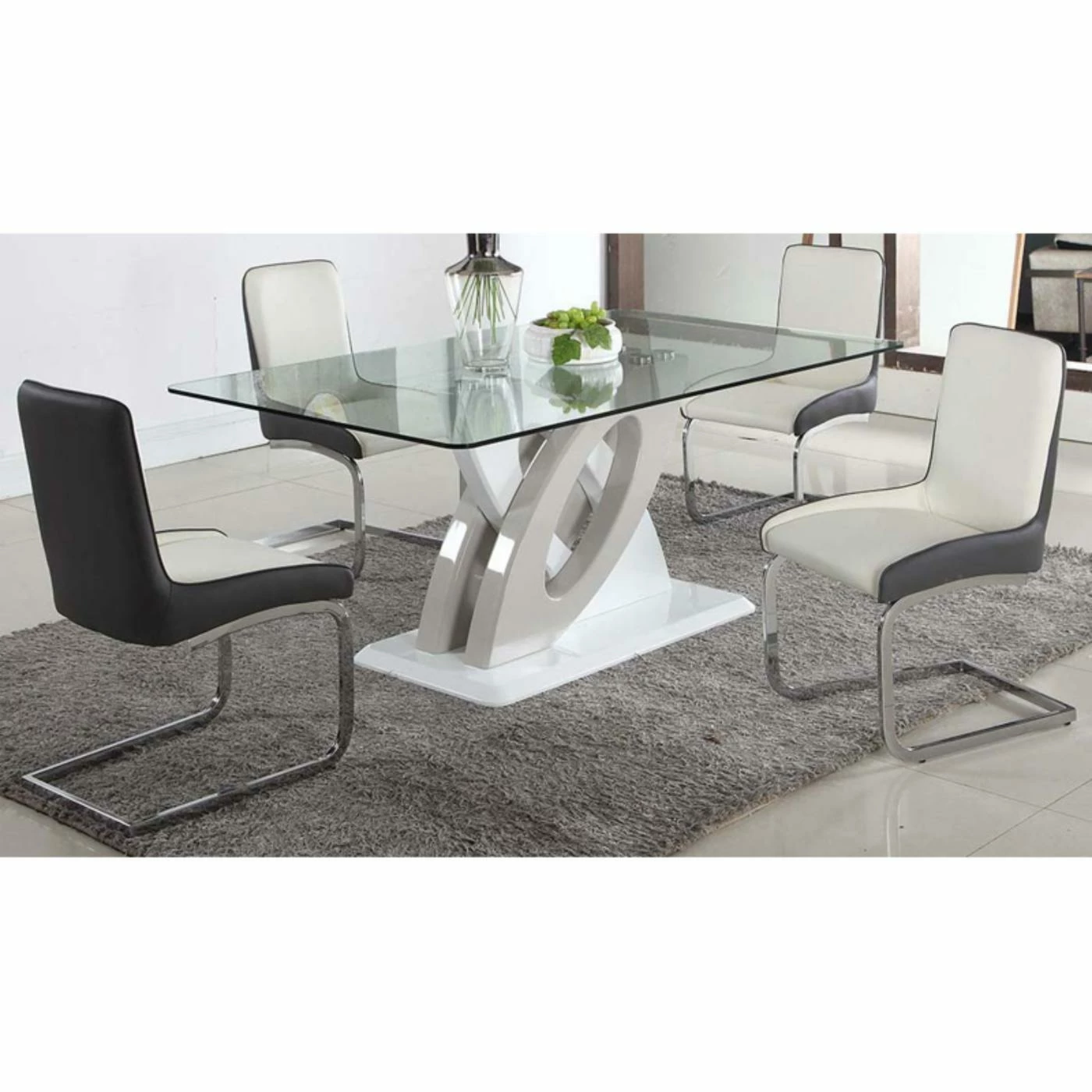 The comfortably audacious Chintaly Stella 5 Piece Dining Set invites modern style into your dining space. This set includes a dining table with clear glass top and four bucket style chairs. To support its glass top, the table is graced with a sweeping open pedestal base in high gloss white and gray. Four scrumptious two-toned brewer style side chairs blend beauty with function. Gray and white faux leather upholstery and chromed metal cantilever legs complete the look.