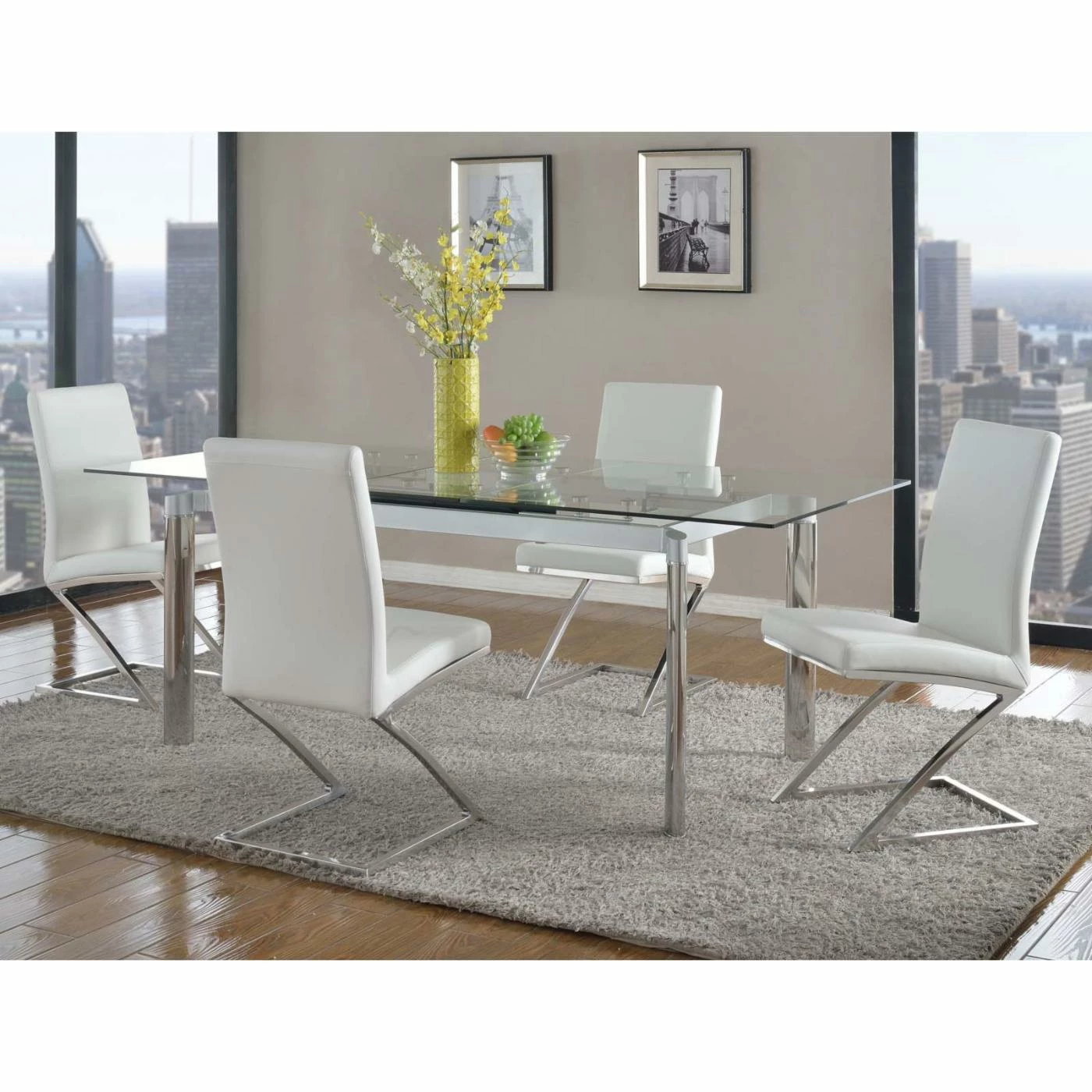 Liven up your dining room with the addition of this sleekly modern Chintaly Tara 5-Piece Dining Room Set with Jade Chairs. Both the chairs and the dining table rest on chrome metal frames. Each of the cushioned chairs offer comfy sitting. The clear glass tabletop is spacious enough to host four diners at a time.