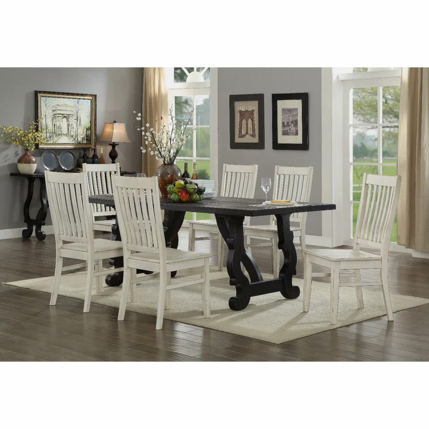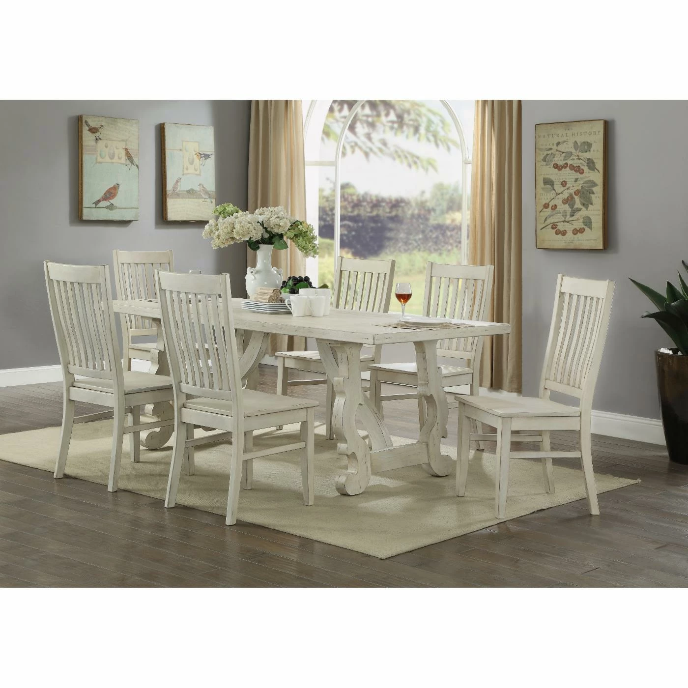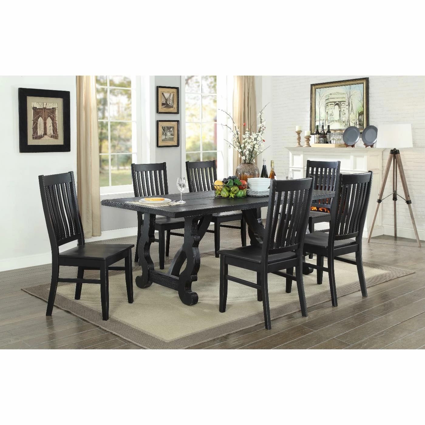 A robust, harp-inspired trestle base graces the Coast to Coast Orchard Park 7 Piece Dining Set with French provincial style. Slat back chairs with contoured wood seats complete the farmhouse feel. The table offers room to seat six. The pieces in this dining set are built of wood and offered in your choice of available finish options.