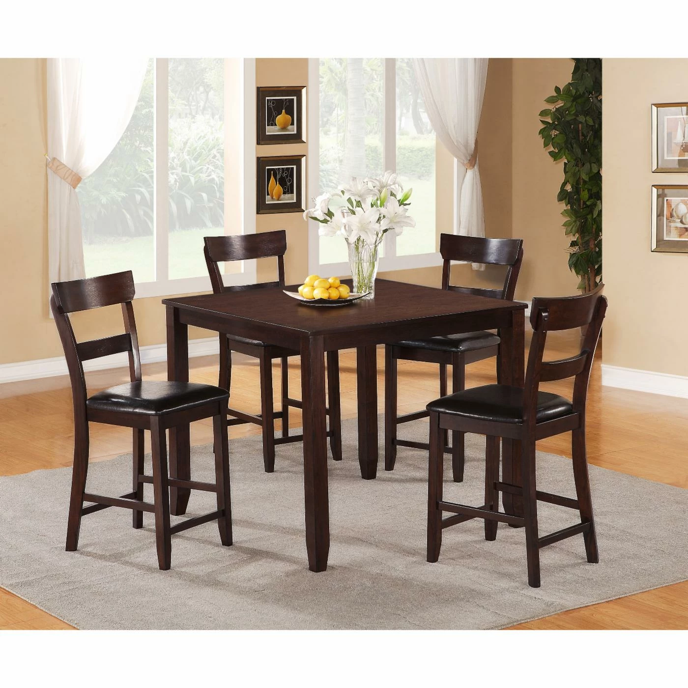 With its rich finishes and clean lines, the Crown Mark Henderson Vinyl Rectangular 5 Piece Counter Height Dining Table Set will have your dining room sitting pretty. This dining set features sturdy wood frames that are topped in a rich brown finish. The brown of the wood is attractively contrasted by the black faux leather seat upholstery for a design that feels modern and fresh. Its transitional design allows this set to suit your home with ease.