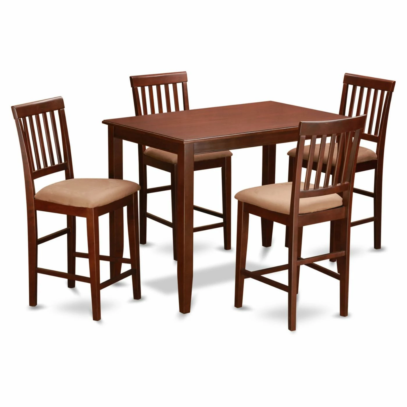 Enjoy a family dinner around the contemporary East West Furniture Buckland 5 Piece Slat Back Dining Table Set. This table and chairs set is constructed from strong wood and finished in a rich mahogany tone. The four chairs feature optional leather cushioning for extra comfort. The subtly angled chair backs feature simple slat design.