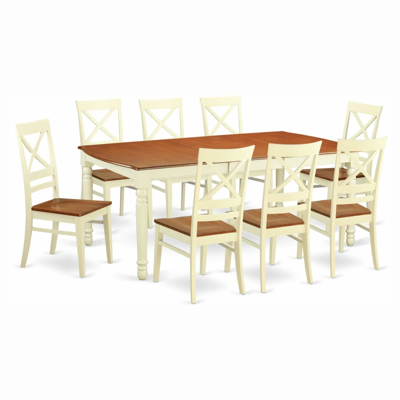 Cottage chic X-backed chairs and a friendly two-toned buttermilk and cherry finish give this East West Furniture Dover 9 Piece Extension Rectangular Dining Table Set with Quincy Wooden Seat Chairs a welcome dining room addition. As generous as you, this dining set includes eight chairs with contoured wood seats and a table with 18-inch self-storing leaf that seats up to 8 people.
