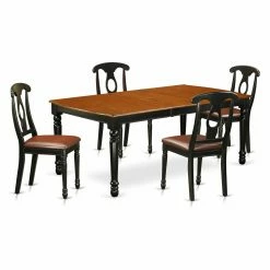 Give your dining room or kitchen an elegant transitional vibe with the East West Furniture Dover DOKE5 Five Piece Extension Dining Table Set. The solid hardwood dining set flaunts shapely turned legs and an attractive two-tone cherry and black finish. For effortless entertaining, the tabletop expands with an 18-inch self-storing extension leaf. Each of the four chairs has a sophisticated pierced back with a shapely arched top.