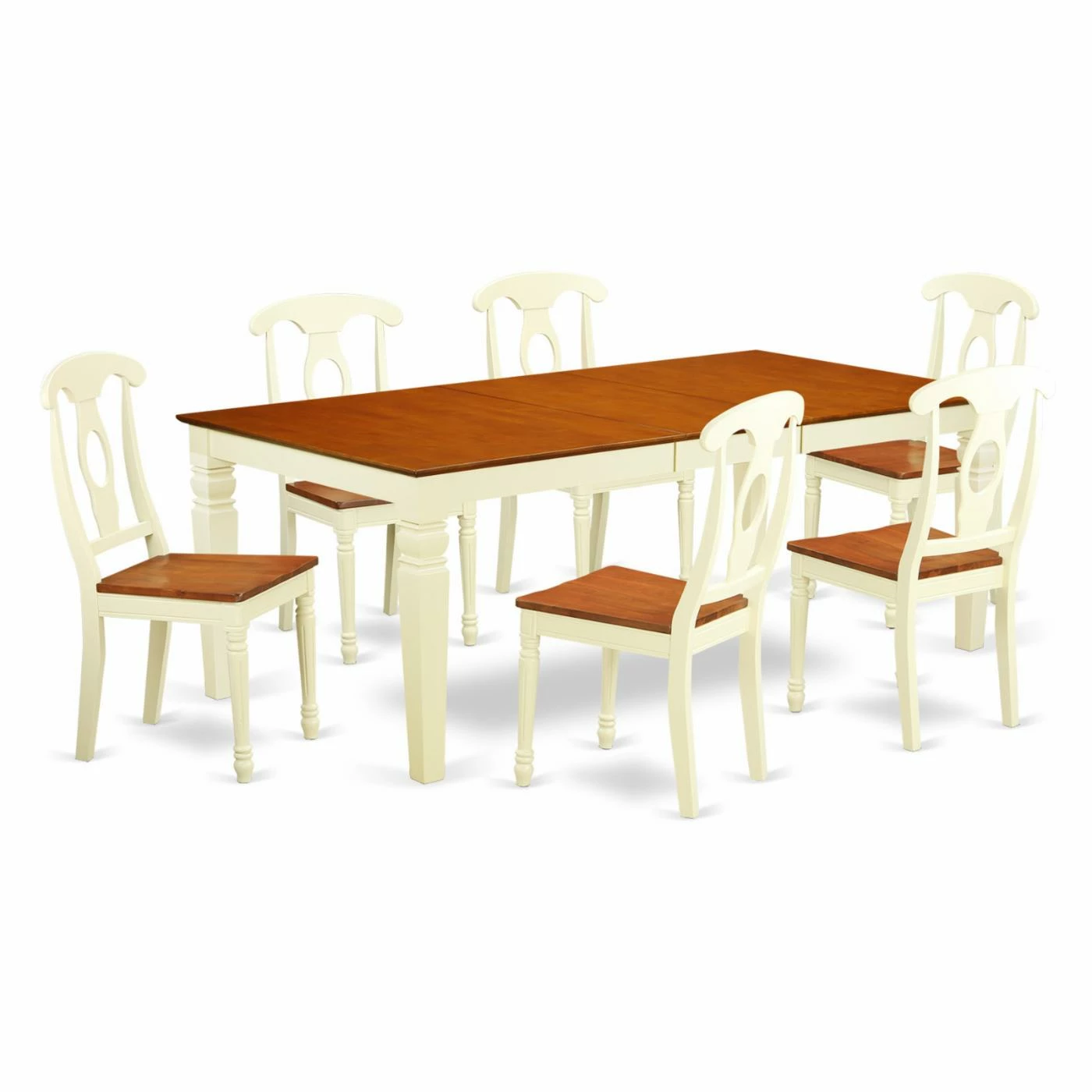 The mission-inspired style of the East West Furniture Logan 7 Piece Keyhole Dining Table Set makes it a set that seamlessly combines classic styles with the robust durability that you need from a quality dining set. Each piece in this set is crafted from solid rubberwood and offered in a variety of finish options. The wide, rectangular table has block-style legs with carved details and a tall apron. Beneath that expansive tabletop is a butterfly extension leaf that pops out and extends the length of the table by 18 inches. Each of the chairs features contoured seats, lathe-turned front legs, and a keyhole-style backrest.