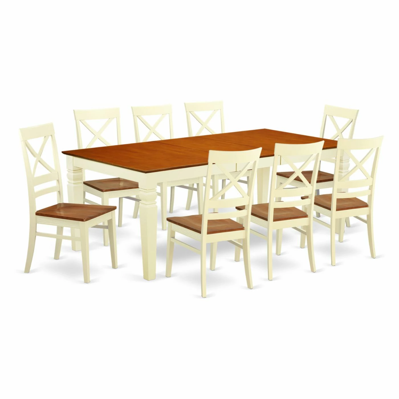 The East West Furniture Logan 9 Piece Cross-And-Ladder Dining Table Set has a touch of Mission-inspired with a modern sensibility that makes it an easy choice for any space with a modern style or an appreciation for the classics. This set includes a table and six chairs, each crafted from solid rubberwood and offered in the finish of your choice. The chairs show off a cross-and-ladder pattern in the backrest with simple, straight legs and a contoured seat over carved details on the seat box. The table features thick, blocky-style legs with carved details and a bold taper near the floor. An 18-inch butterfly extension leaf is hidden beneath the tabletop, and when you need a bit of extra room, it removes and installs easily so you can add length to the table.