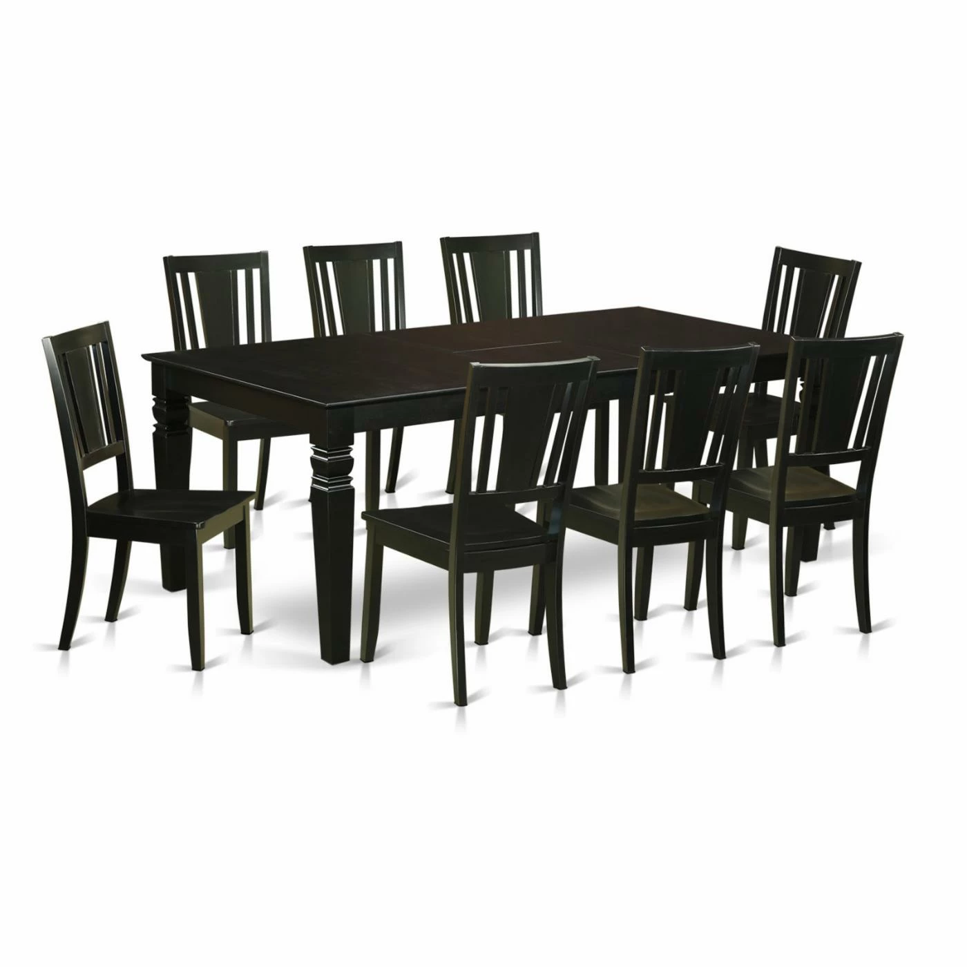 The East West Furniture Logan 9 Piece Scotch Art Dining Table Set combines a sleek finish with a touch of classic style to create a set that will be an easy choice for your kitchen on dining room. This set includes eight chairs around a rectangular table, each crafted from solid rubberwood and finished in a high-shine shade of jet black. The tabletop pulls apart to reveal an 18-inch butterfly extension leaf that can be stored beneath the surface when not in use. Each of the matching chairs offers a curved backrest and a selection of seat options that allow you to customize the set to suit your comfort level and taste.
