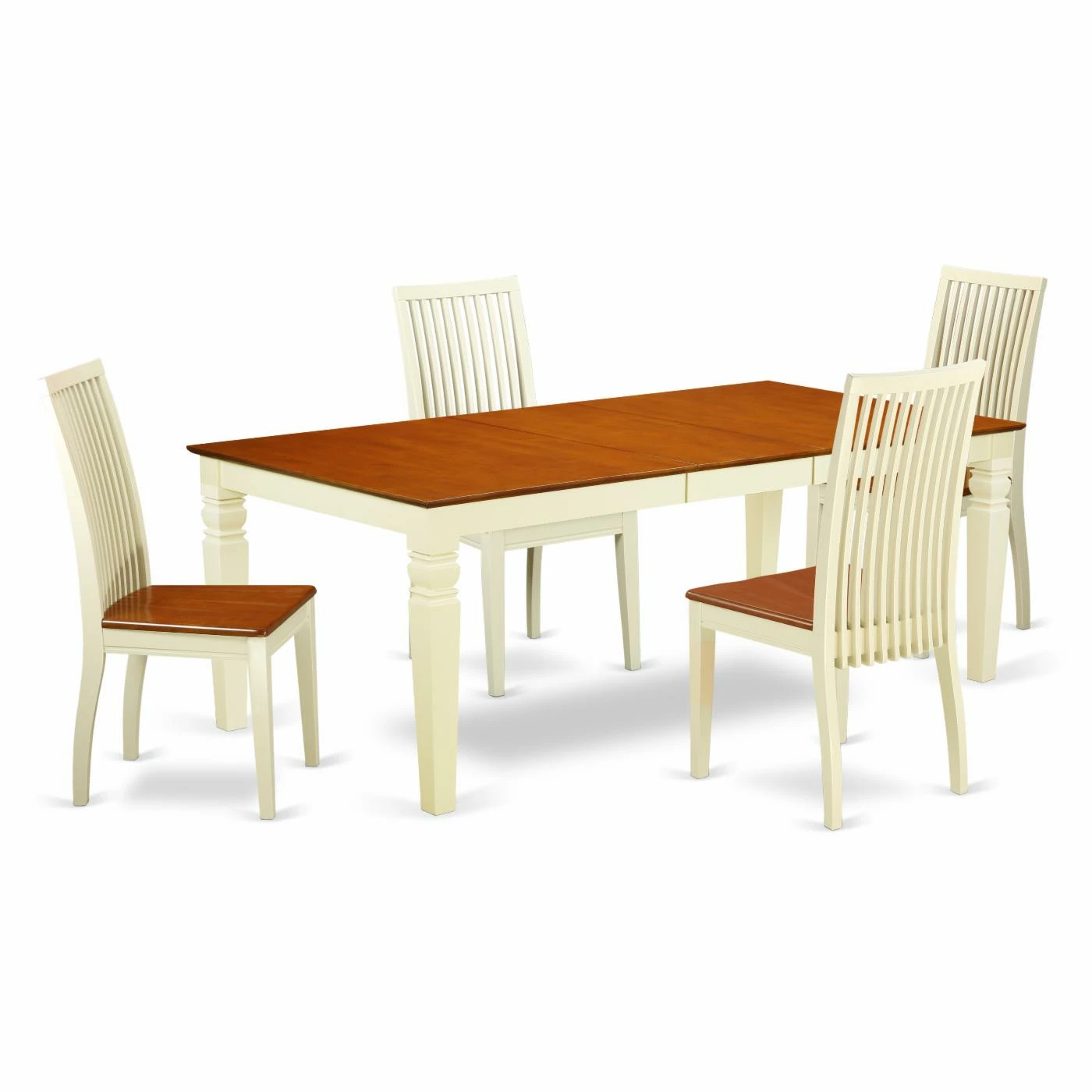 Introduce elegance to your dining room or kitchen with the East West Furniture Logan LGIP5 Five Piece Extension Dining Table Set. The set features a rectangular dining table with stately carved legs and four dining chairs with curved slat backs. Entertaining is easy with the 18-inch extension leaf that stores away under the tabletop. Equally ideal for daily use, the furnishings are durably crafted out of solid hardwood.