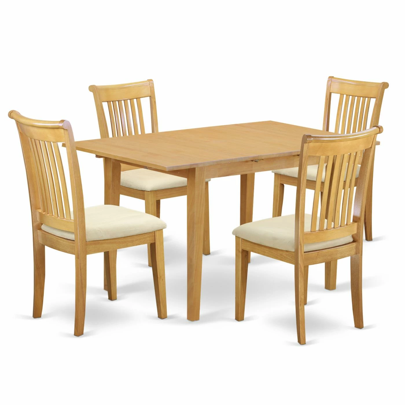 Give your smaller dining space the style it deserves with the East West Furniture Norfolk 5 Piece Dining Table Set – Oak. This dinette set includes four chairs and a table built to last of solid rubberwood and finished in a classic oak. Slat back chairs feature rolled backs and are offered in your choice of available seat options. When you need more floor space than room at the table, simply remove the included 12-inch leaf and store it beneath the table top. This table seats four with the leaf in place.