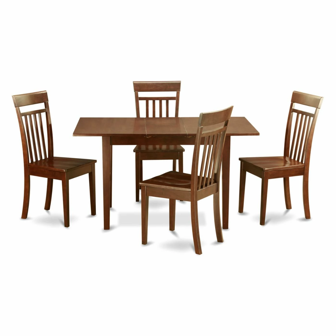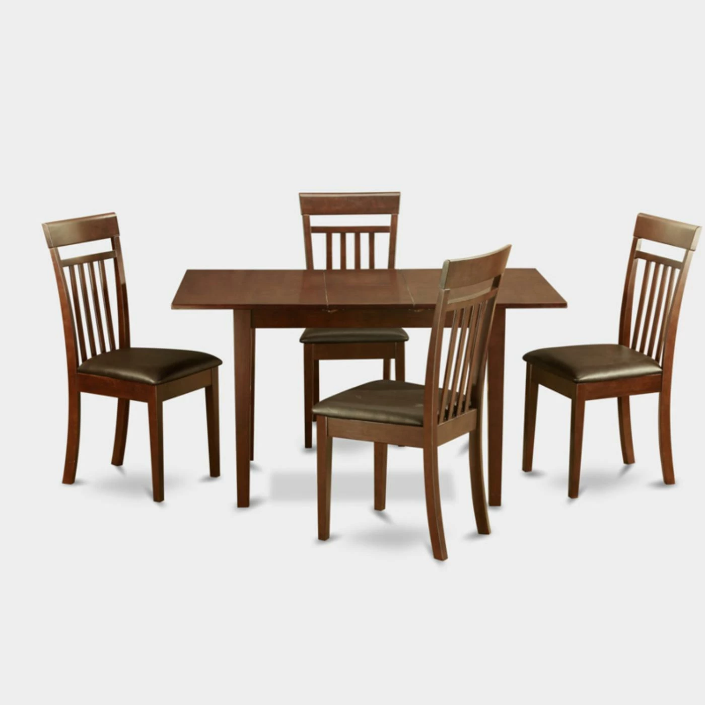 Ideal for smaller dining rooms, the East West Furniture Norfolk 5 Piece Sheraton Dining Table Set is compact, transitional, and offers room to accommodate a few more people when needed. This dining set includes a table with self-storing leaf and four lath back chairs with tapered legs. The chairs are offered in your choice of available seat type. With the leaf in place, the table can accommodate four people. Pieces are built of solid Asian hardwood and come in a versatile mahogany brown finish.