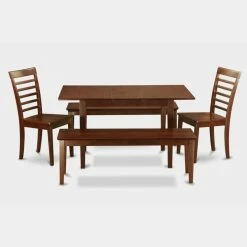 Give your dining room a transitional update by adding the East West Furniture Norfolk 5 Piece Straight Ladder Back Dining Table Set with 2 Benches. Simple lines and classic details make this set a good match to a variety of dΓ©cor. Pieces are built of solid Asian hardwood in a versatile mahogany. It includes a dining table with one self-storing leaf, two ladderback chairs, and two benches. Seating is offered in your choice of available seat type. This table can seat from four to six people.