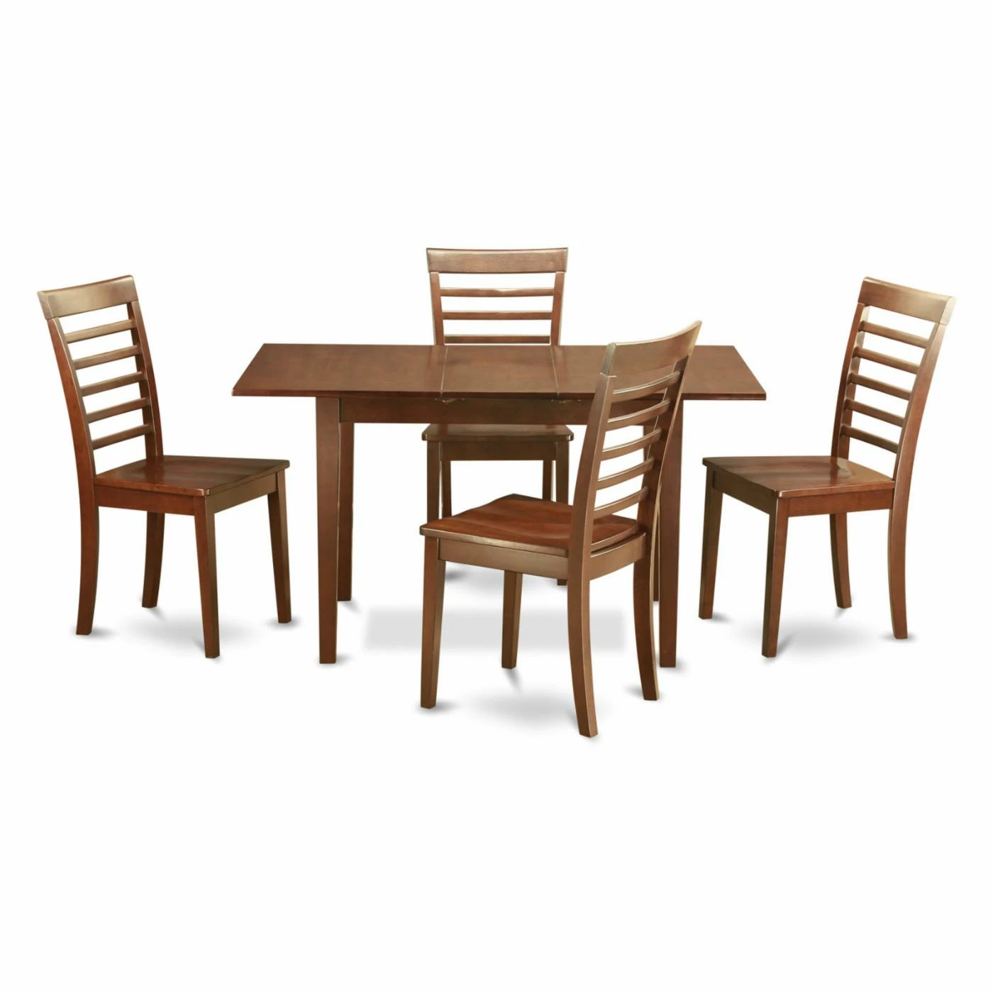 The East West Furniture Norfolk 5 Piece Straight Ladder Back Dining Table Set allows you to design a casual, elegant dining room. The set comes complete with a table, self-storing leaf, and four ladder back chairs with tapered legs. The chairs are offered in your choice of available seat type. With the leaf in place, the table can accommodate four people comfortably. Pieces in this dining set are built of solid Asian hardwood and feature a versatile mahogany finish.