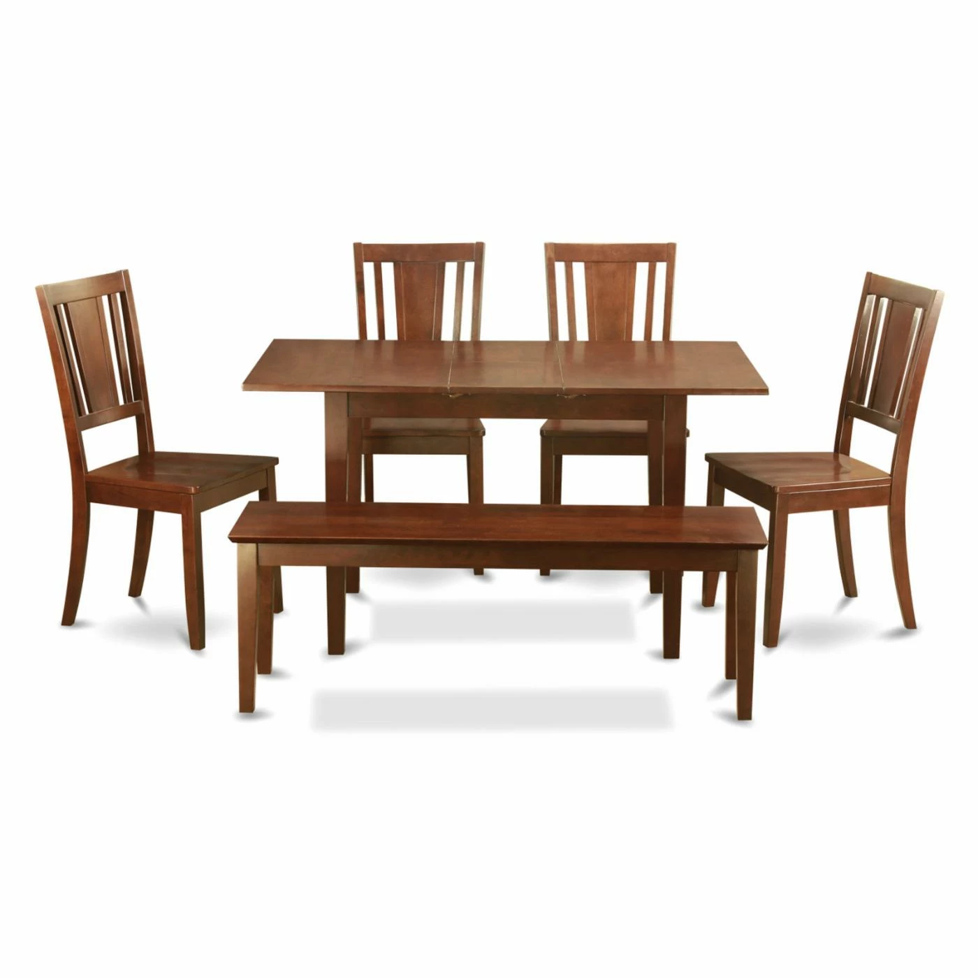 Update your smaller dining room with the transitional East West Furniture Norfolk 6 Piece Scotch Art Dining Table Set. Simple lines, traditional details, and a versatile mahogany finish make this set a good match to your classic or contemporary dΓ©cor. The set is crafted from solid Asian hardwoods for lasting beauty. It includes a dining table with one self-storing leaf, four lath back chairs, and a casual bench that seats two. This table accommodates from four to six people with the leaf in place.
