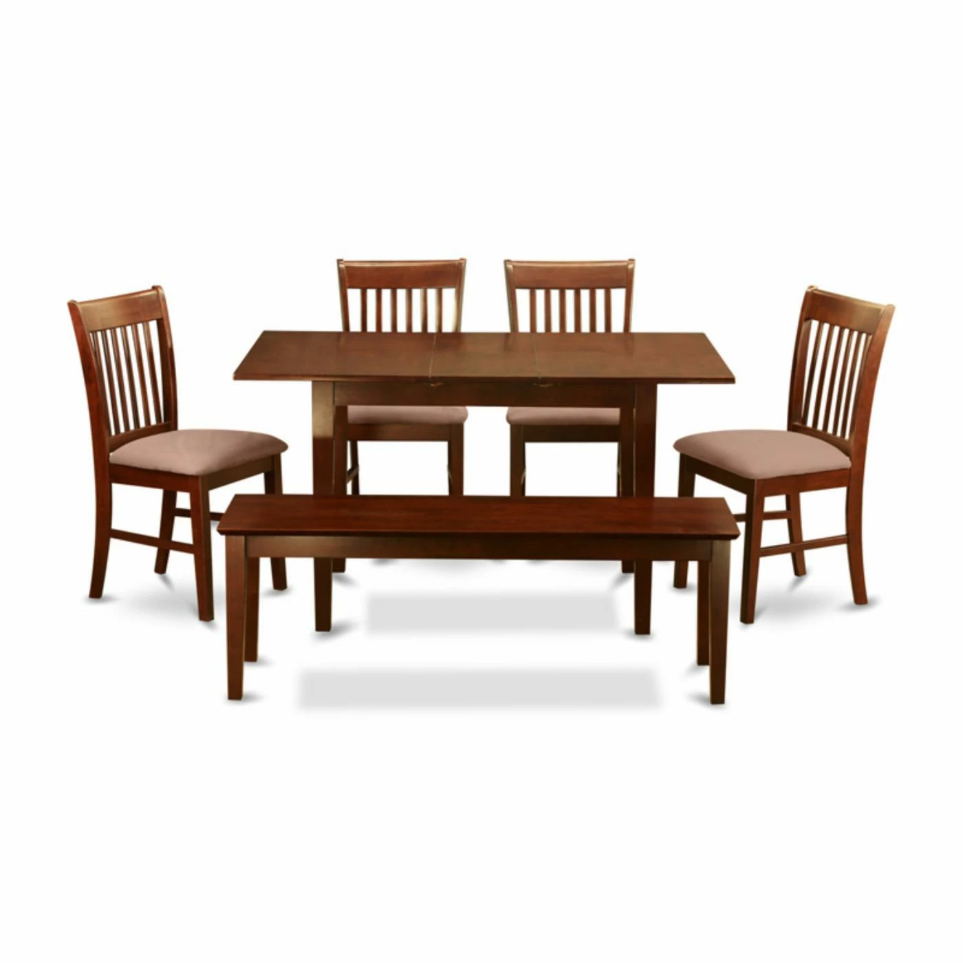For a transitional look, add the East West Furniture Norfolk 6 Piece Slat Back Dining Table Set to your dining room. Traditional details and a versatile mahogany finish make this set a good match to any dining space. Pieces are built of solid Asian hardwoods for lasting beauty. Included is a dining table with extension leaf, four slat back chairs, and a casual bench that seats two. Choose from available seat types to find the right look for your dining room. This table accommodates from four to six people with the leaf in place.
