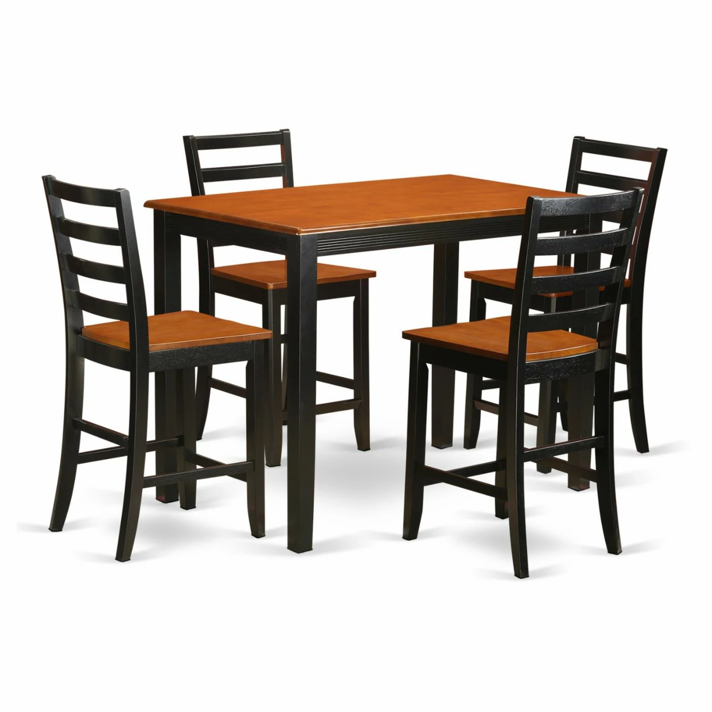 The East West Furniture Yarmouth 5 Piece Ladder Back Dining Table Set is a perfect choice for small dining spaces. Asian hardwood craftsmanship lends a sleek look and sturdy use. High ladder backs offer support when sitting. This dining set is finished in bold black, which contrasts well with the natural hues of the tabletop and chair seats.