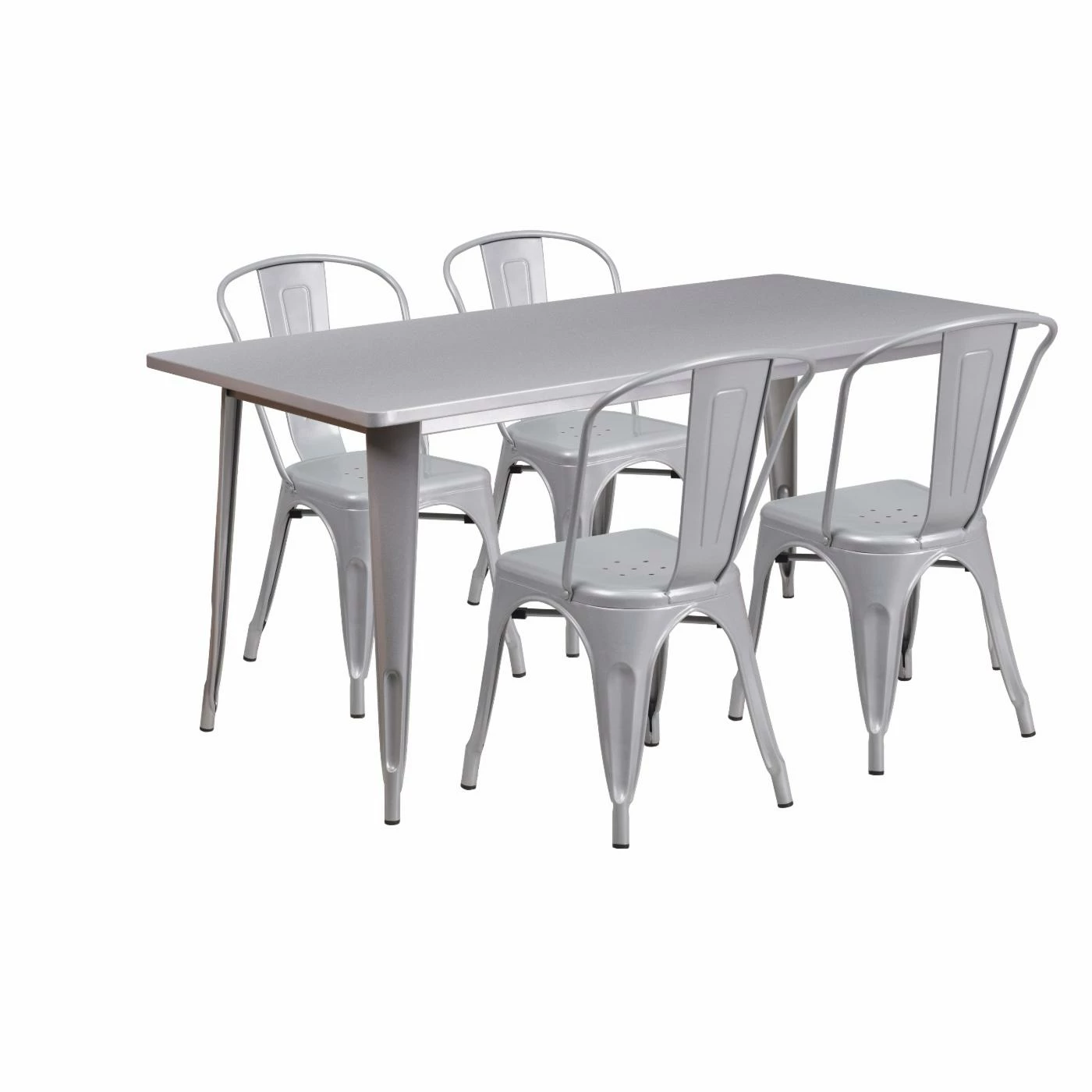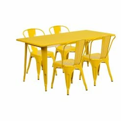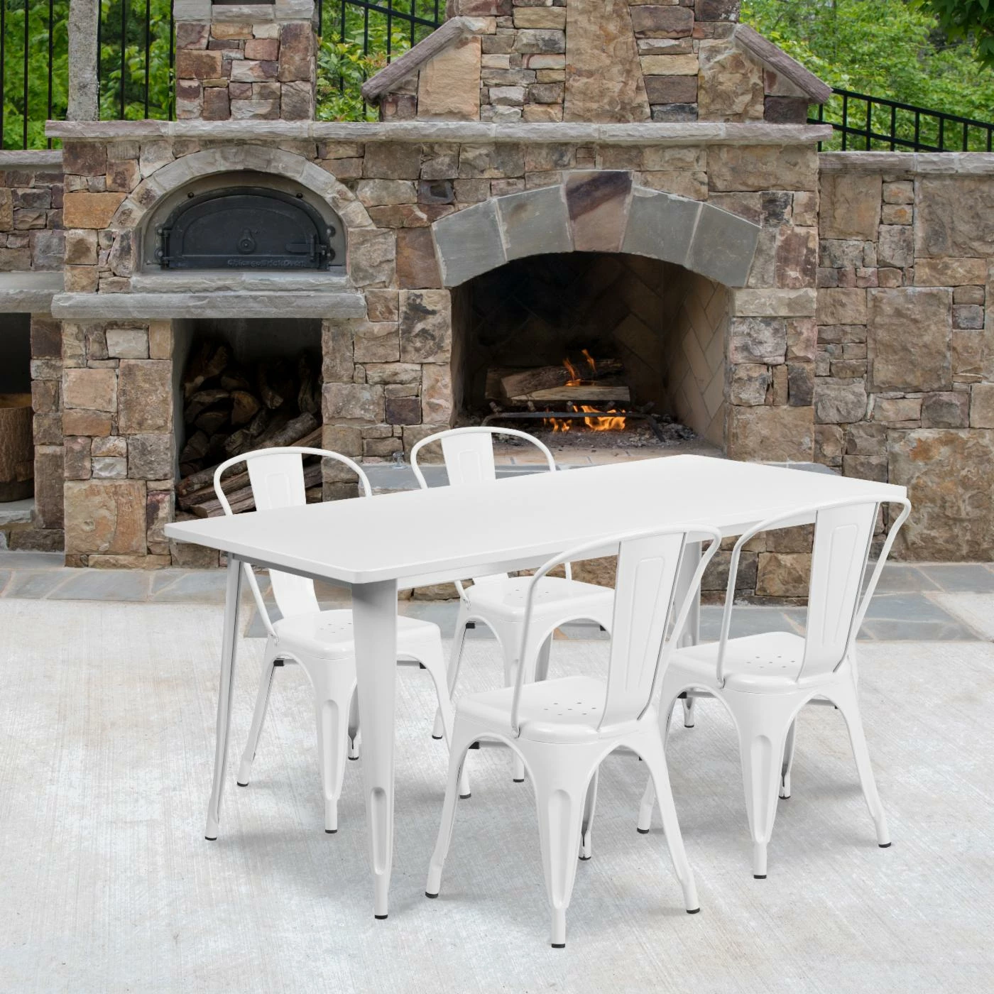 Dine in vintage style by furnishing your space with the Flash Furniture 31.5 x 63 in. Rectangular Metal Indoor-Outdoor Table Set with 4 Stack Chairs. This rectangular table comes with four matching chairs that stack for easy storage. This set is crafted from durable metal and features a powder coat in your choice of available color, making it a great choice for both indoor and outdoor spaces.