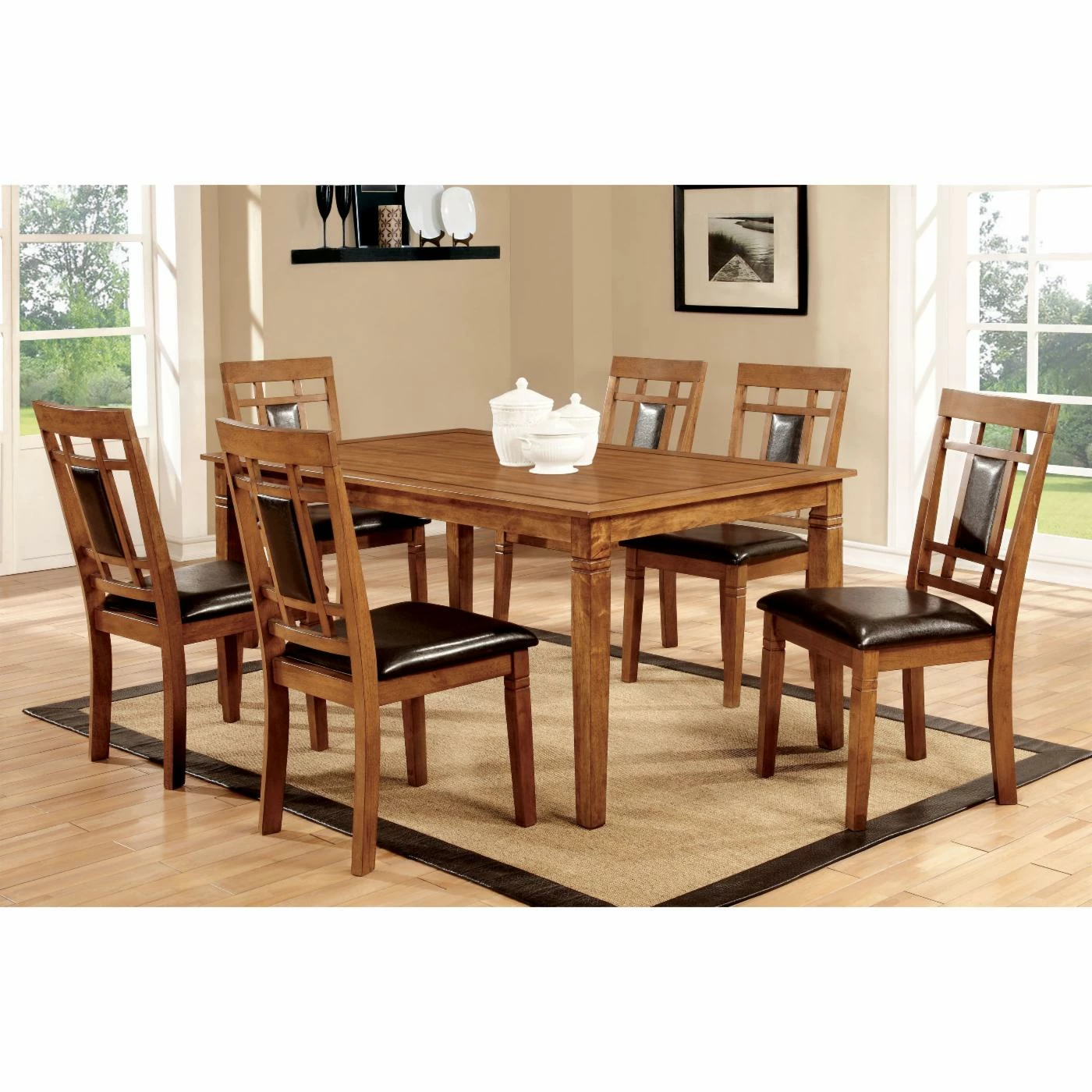 The understated Furniture of America Blandford 7 Piece Wood Dining Table Set keeps things simple for a handsome design that goes great with any dΓ©cor. This traditional collection includes six lattice back chairs with dark brown faux leather upholstery and a light oak finish to match the accompanying table. The subtle groove marks on the tabletop and legs provide just the right accent to this understated centerpiece.