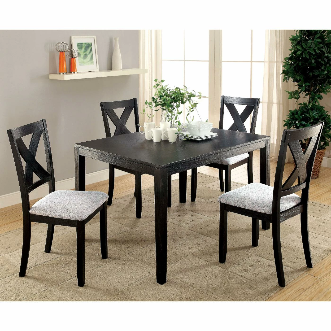The Furniture of America Demarca 5 Piece Casual Dining Set will be an elegant addition to your home with its distressed espresso finish, and plush upholstered seating. This dining set is crafted of smooth wood with grainy detail that holds up to the test of time for years of enjoyment. The chairs of this set feature wide X-shaped cutouts at the back to create a contemporary, airy look.