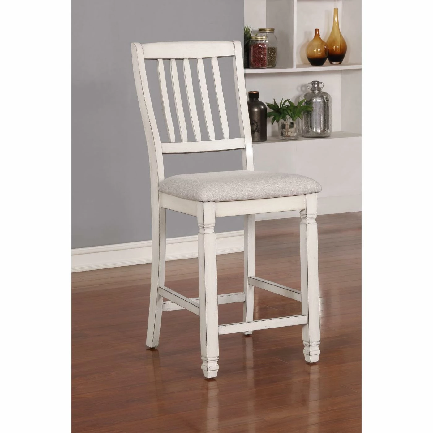 An excellent choice for a family or avid entertainer, the Furniture of America Loretta 7 Piece French Country Weathered Counter Height Table Set seats six. It’s crafted from a sturdy blend of solid wood and wood veneers and can withstand everyday use. The set has a distressed antique white finish that adds loads of character, and all of the pieces have turned legs. The table is designed with fully extendable drawers and three tiers of shelving. The seats are comfortably cushioned and upholstered with a textured light gray fabric.