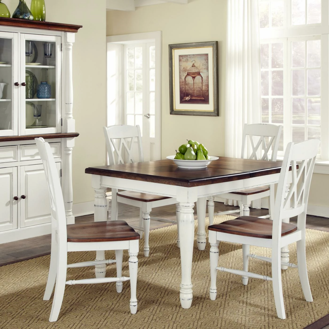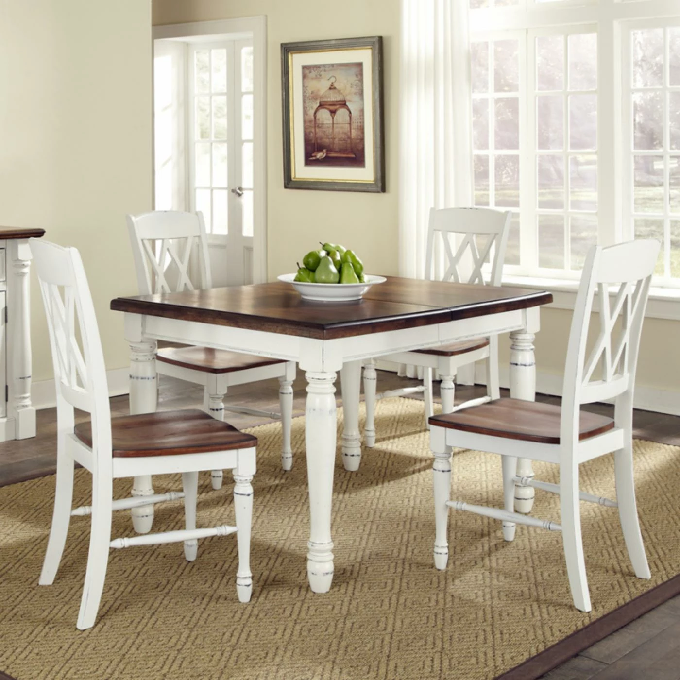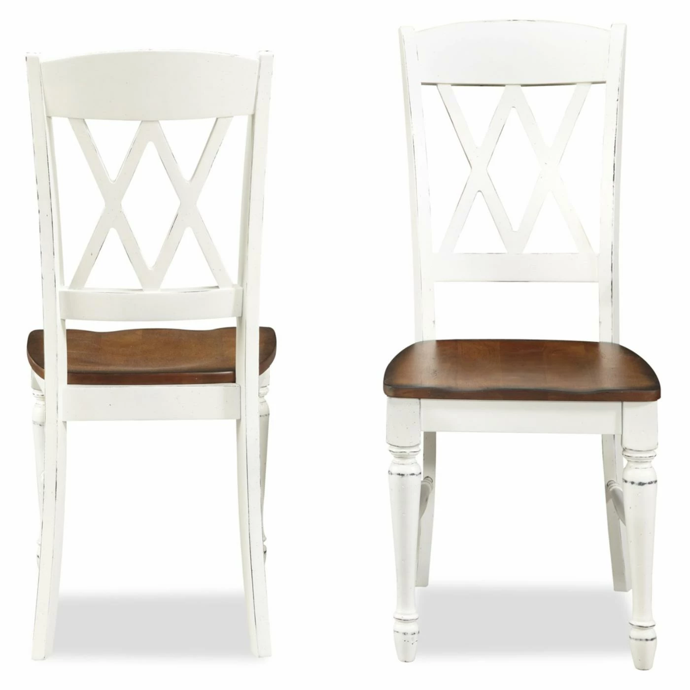 The Monarch 5 pc. Dining Table with 4 Double X-Back Chairs – White & Oak is great for weeknight meals, dinner parties, or casual brunches with friends. Crafted of hardwood solids, engineered wood, and veneers, the table features turned legs with carved details for an elegant look. The table legs and apron feature a rubbed white finish, while the top has a warm, rich multi-step distressed oak finish. It seats four people, and when you need space for more than four, simply add the leaf for an extra 18 inches of table space. That’s plenty of room for up to six guests to sit and dine comfortably. Included with the table are four matching chairs with a double X-back design and solid wood turned legs with a rubbed white finish. Featuring a multi-step distressed oak finish, the chair seats are contoured for optimal comfort.
