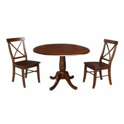 Even the smallest dining rooms can experience farmhouse style thanks to the International Concepts 3 Piece Round Pedestal Dining Set with Drop Leaf. The set includes a table and two matching chairs, all made from solid wood in an espresso finish. The table includes a 9-inch drop leaf on each side so you can always make room for more.