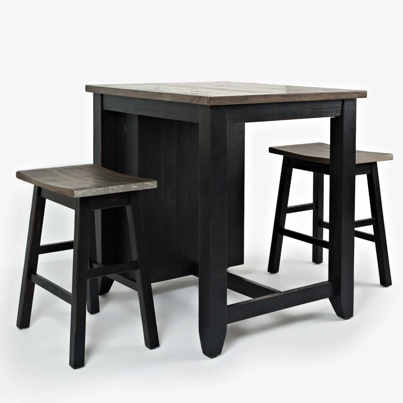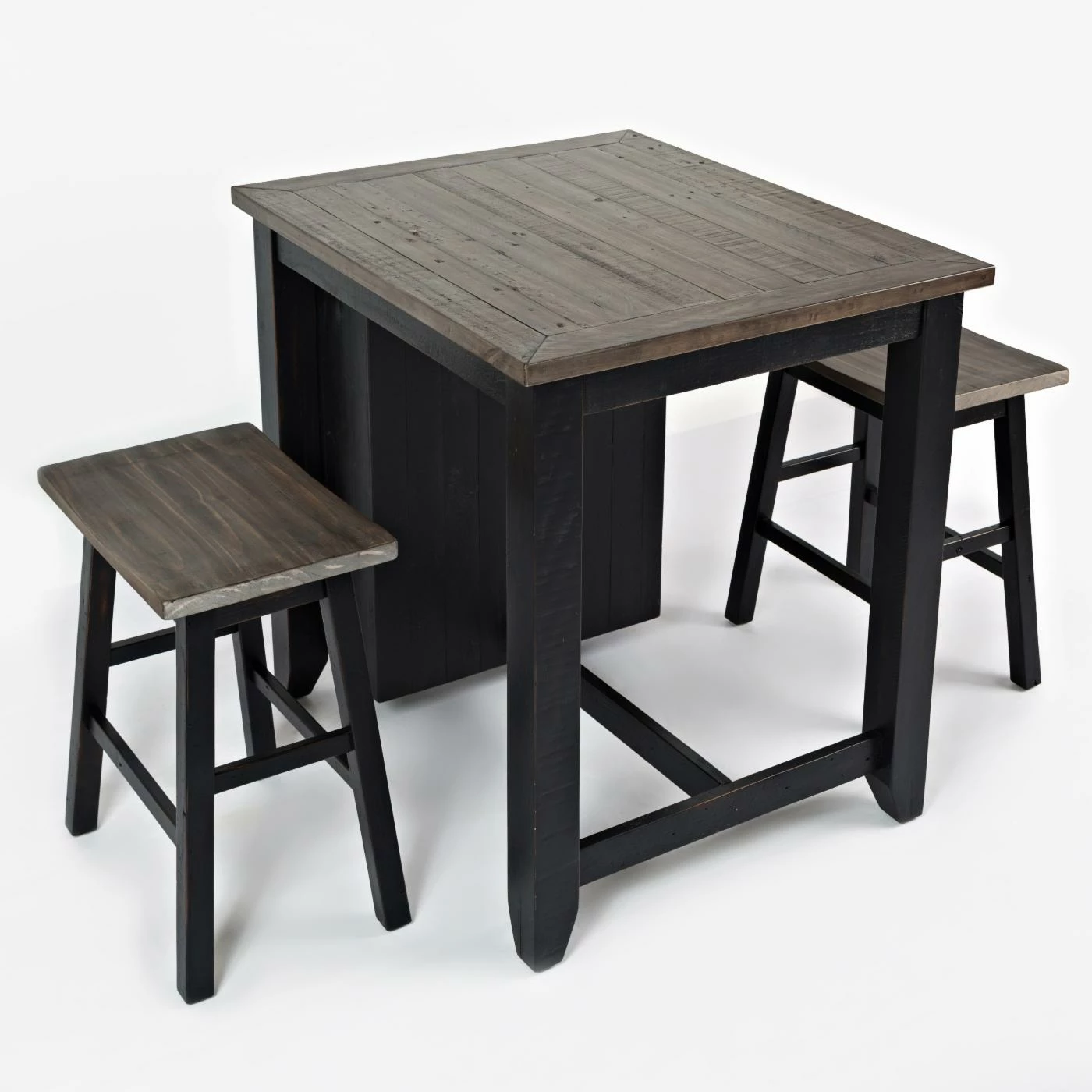 Bring fresh farmhouse charm to your kitchen or dinette with the Jofran Madison County 3 Piece Counter Height Dining Set. Pull up a stool with your friend and enjoy whiling away a morning with coffee and conversation. The stools provide comfortable scoop seats and bar footrests for those long sitting sessions. With three built in shelves, the table is a handy multi-tasker, giving you a stylish place to eat and store your dishware and napkins. This handsome dining set is crafted from solid reclaimed pine wood for a design that’s durable and rustic-chic. Choose from the available finish options.
