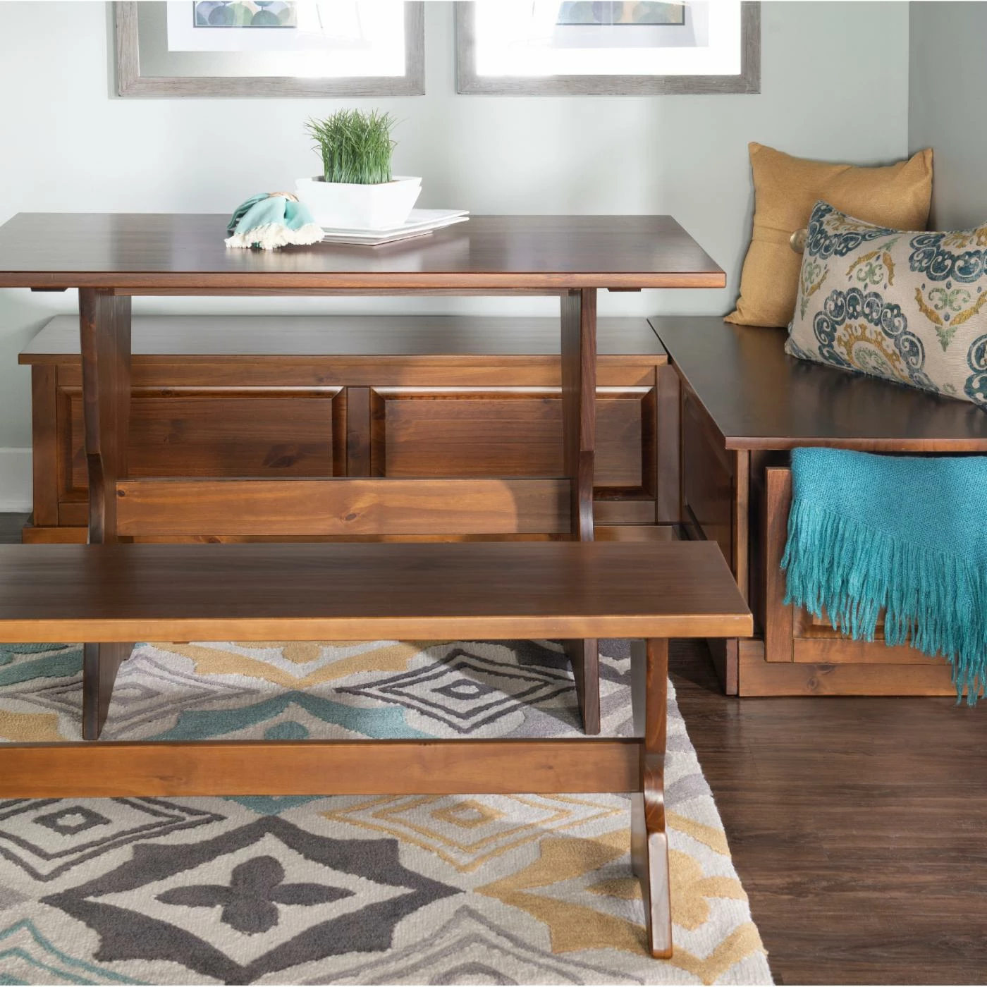 Lend your modern kitchen a handsome and functional place to enjoy your daily meals with the Linon Colby Backless Breakfast Nook. This set includes a backless, L-shaped nook seat, a bench, and a table. Each piece comes constructed from thick pine hardwood solids and finished in a walnut brown. The nook seat has a paneled look and a lift-top design that reveals interior storage for cushions, dishes, and more.