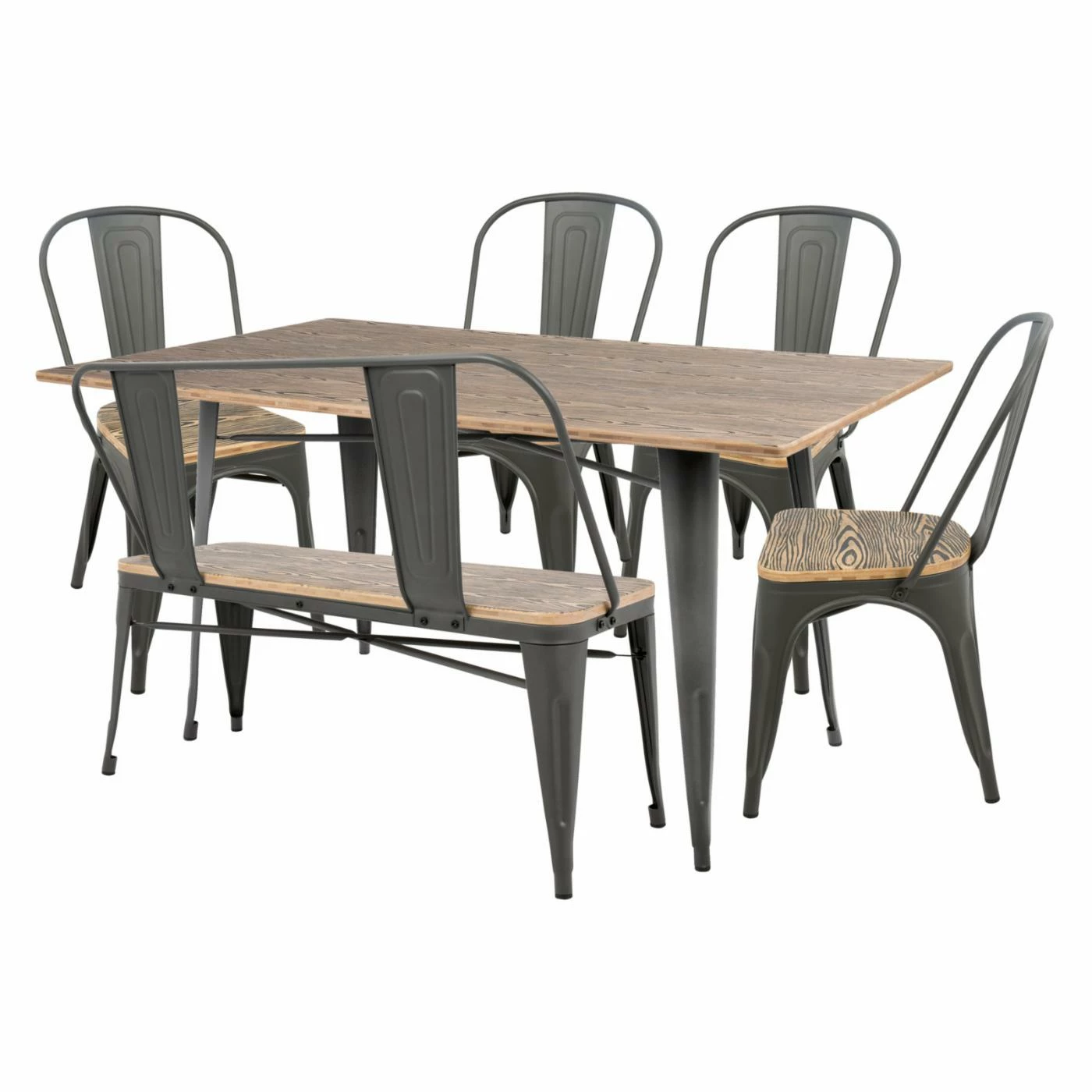 - Set includes dining table, bench, 4 chairs