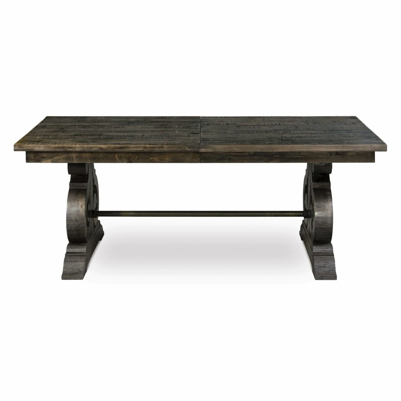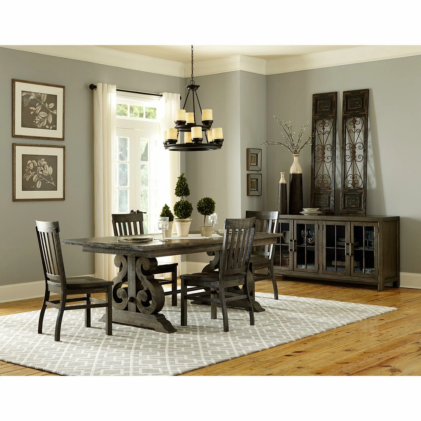 The Magnussen Bellamy 5-Piece Rectangular Dining Table Set offers a new look for lovers of contemporary rustic dining, highlighted by a grand pine wood table with magnificent scroll legs joined by an antique brass stretcher with pewter overlay. Pristinely crafted yet exceptionally comfortable, this set includes four slat-back chairs built with supporting leg stretchers and contoured seats, with visible wood planks that accentuate the visual appeal of the deep weathered pine finish. The large table also comes with two butterfly extension leaves for larger dining parties.