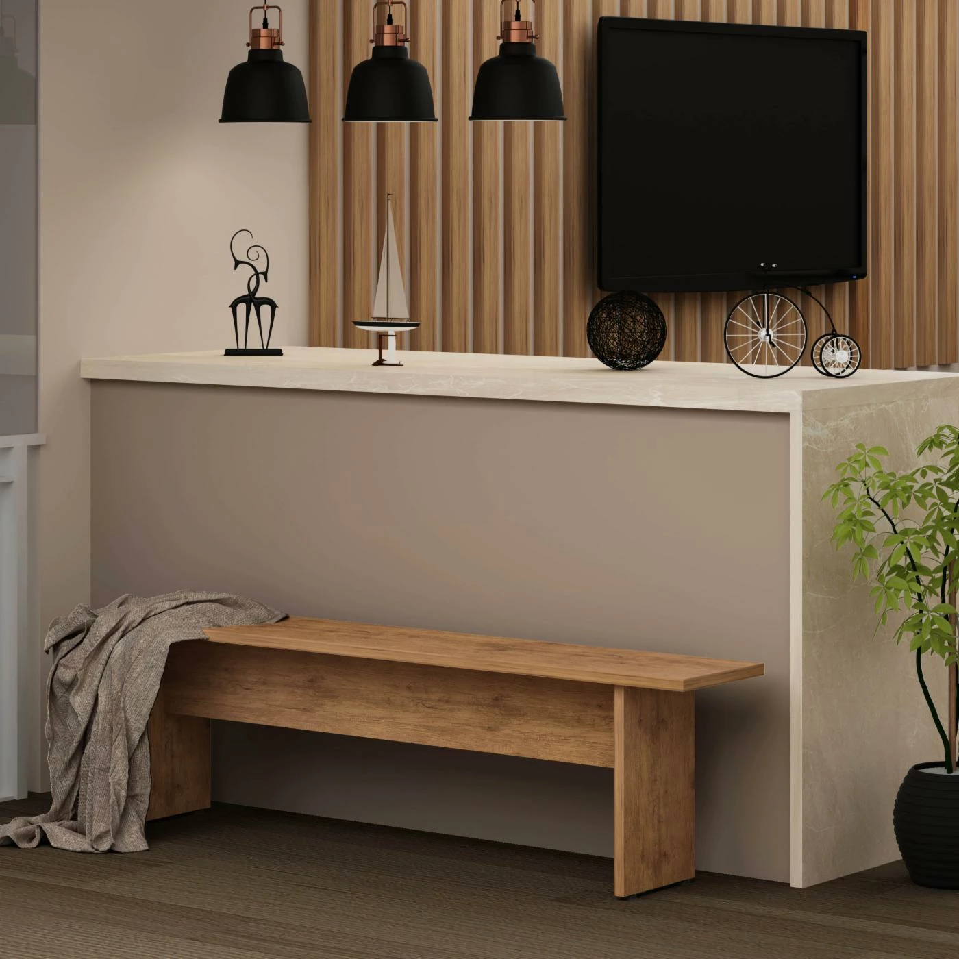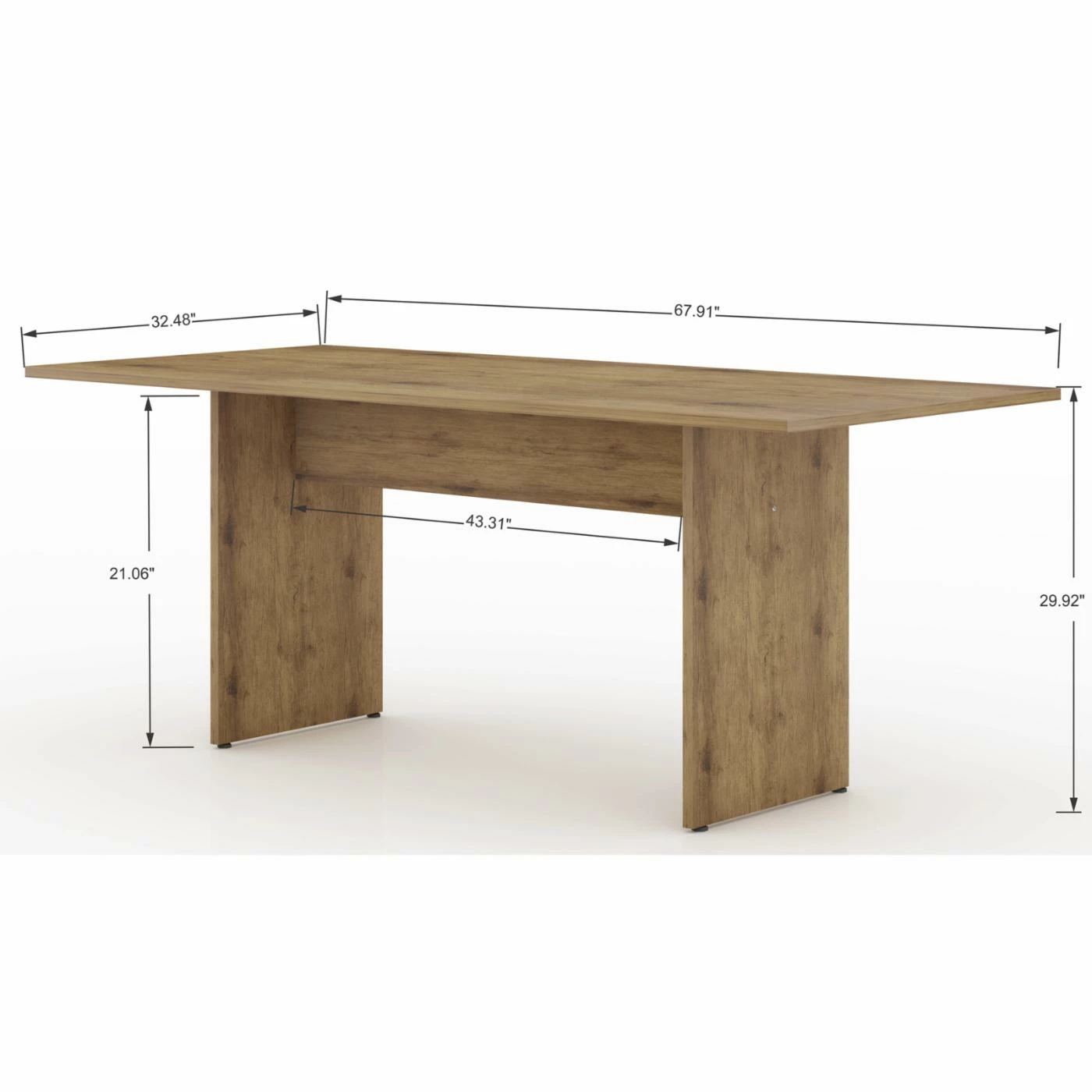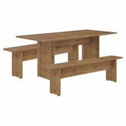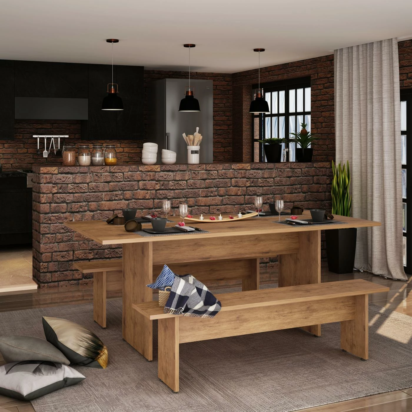 You and six of your family members or friends will join you for dinner around the Manhattan Comfort Nomad 3 Piece Country Dining Table Set. The double pedestal base on the table and two benches add an even more craftsman style look to the set. This dining table set is constructed from engineered wood and steel in a natural, unfinished design. The footpads on the bottom will keep your floors skid free.
