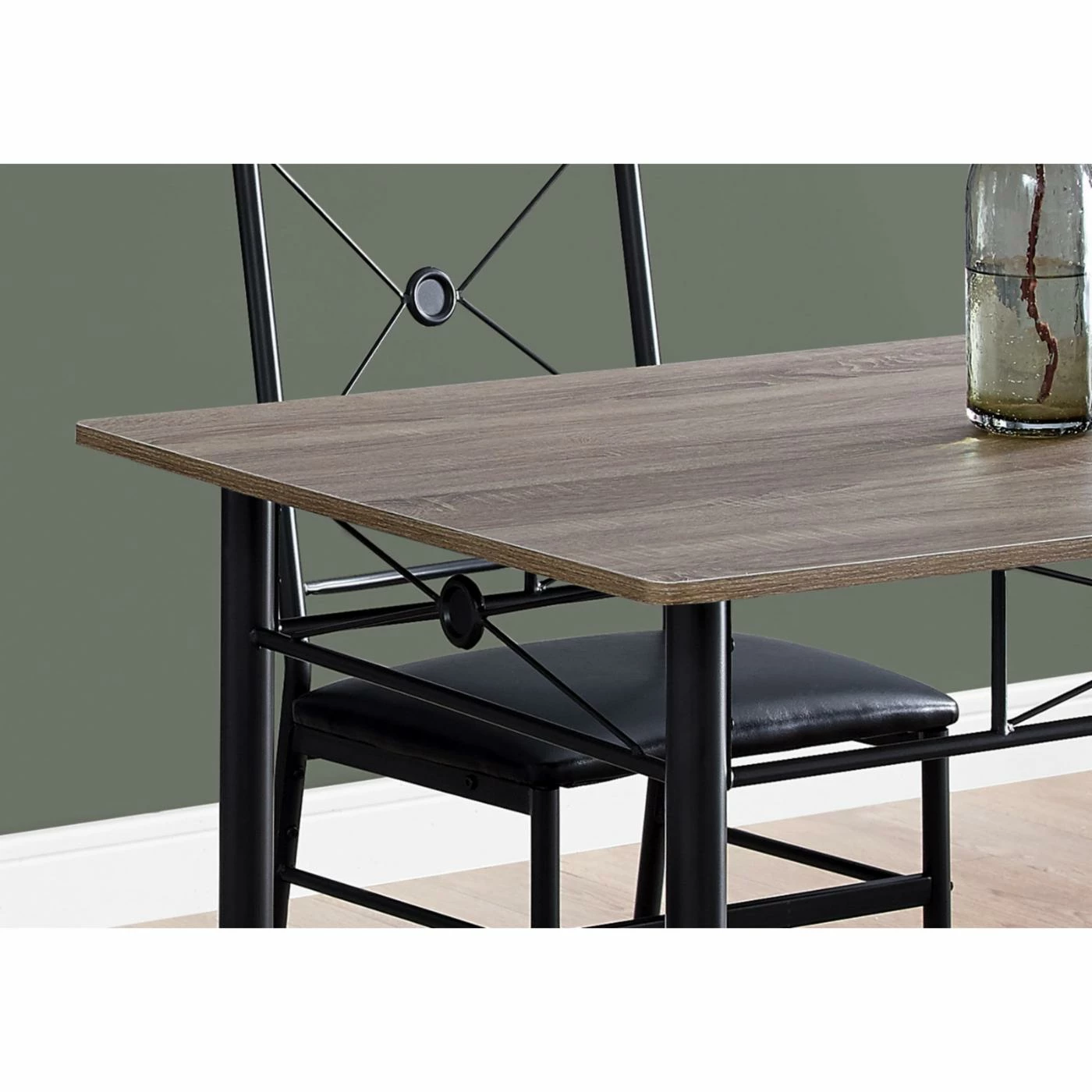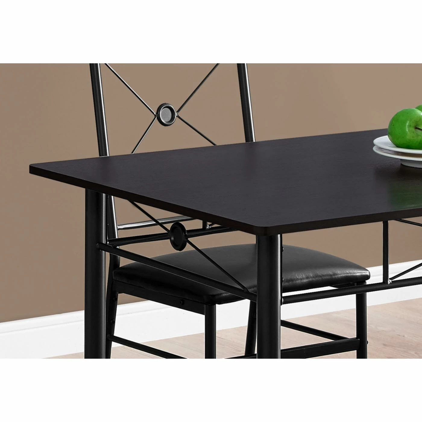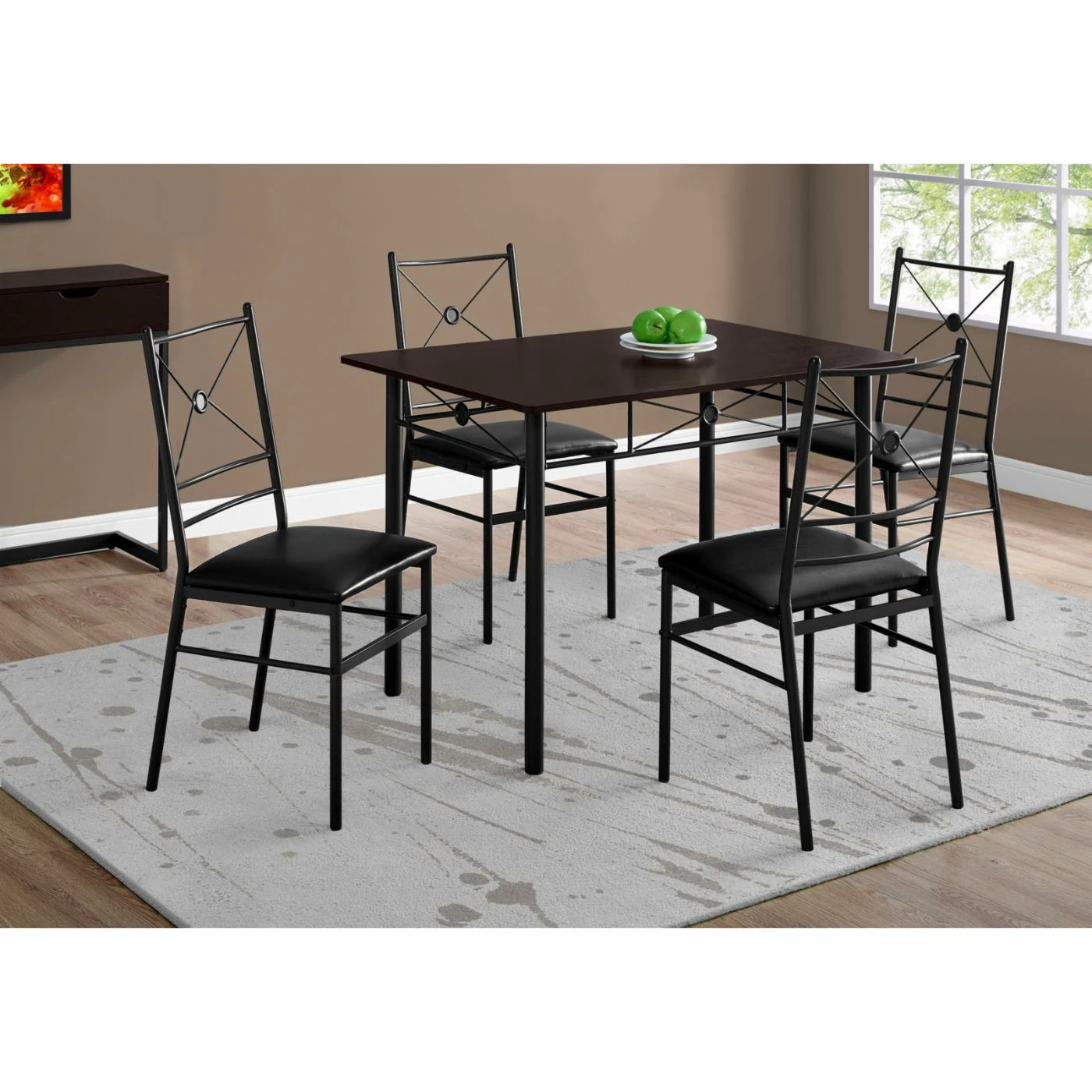 The Monarch Specialties 5 Piece Dining Table Set with Cross Back Chairs is ideal for small yet stylish living spaces. This compact dining table set features bold style with black metal frames and eye-catching X accents on each chair back and table apron. Padded faux leather seats offer a comfortable place to sit and relax. The four chairs nestle neatly under the table when not in use, freeing up space around your table to open up your room. This classic set provides all of the mealtime essentials while offering a fresh, contemporary look.