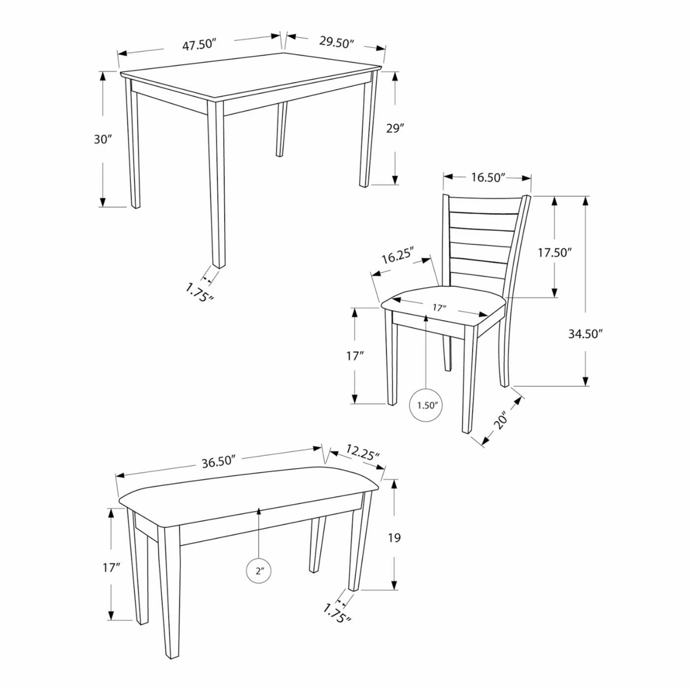 - Bench: 36.25L x 12.25W x 19H in.
