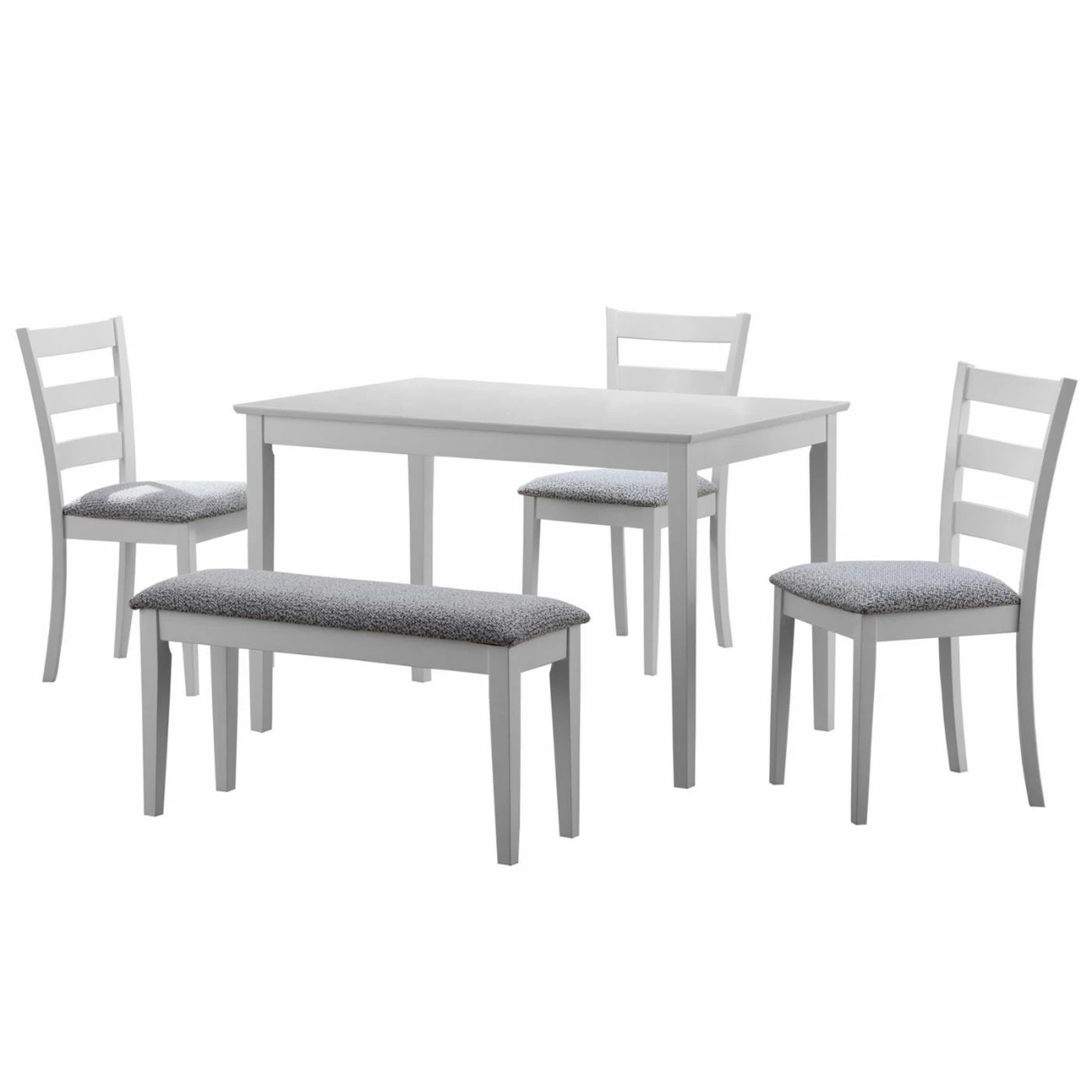 Each piece is crafted of engineered wood in a crisp white finish. Ladder-style chair backs add to the chic simplicity, and you’ll love how the seats are upholstered in two-tone chenille fabric and padded with cozy foam.